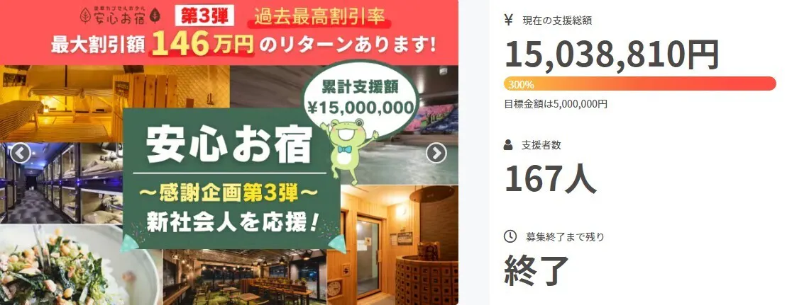 2022年6月12日をもちまして、【支援総額1500万円↑大人気プロジェクト第3弾!宿泊もサウナも超お得なリターン!】のクラウドファンディングを終了いたしました。