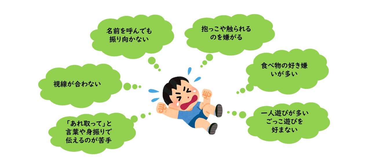 ASDの特徴の例として、癇癪を起こす、名前を呼んでも反応がない、視線が合わない、ひどい偏食である、こだわりが強い(興味・関心が限定される、特定の行動を繰り返す)、抱っこや触られるのを極端に嫌がる、電車などの大きな音が苦手などの感覚過敏などがありますが、何気ない日常生活にも彼らにとっては生きづらいものとなっているのです。