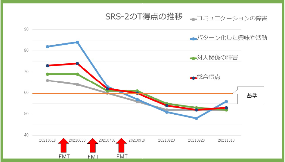 腸内フローラ移植後のSRS‐2検査ではコミュニケーションやこだわりの強さ等の得点に大幅な軽減がみられることが多いです。 (59点以下が正常範囲とされています)