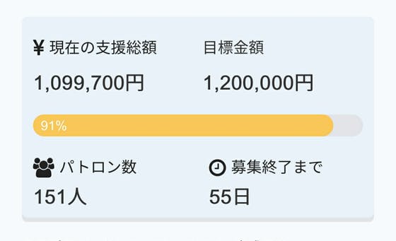 1月27日9時46分現在で達成率91%。ありがたいことに現在も、1日2~5名様ペースでご支援いただいております。