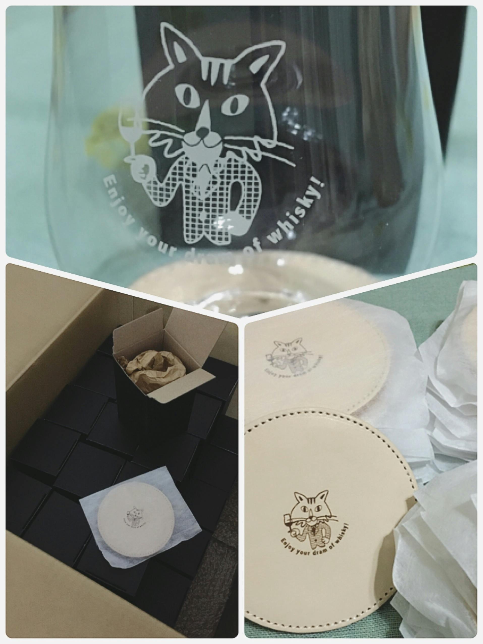 本書キャラクター、ウイスキーキャットの「アビィ」のグラスとコースターが完成しました。