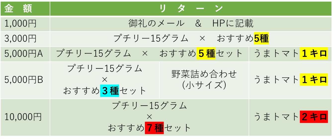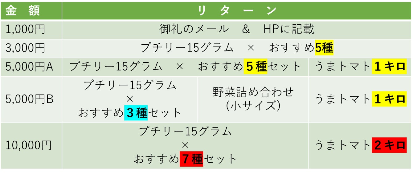 2022/08/13 18:18Glutenfree Village Japan様コメントいただきありがとうございます。率直なコメント非常に有難いです。全くおっしゃる通りだと思います、情報が不足しておりすみません。以下、それぞれの疑問点に関してのお返事です。長文になってしまいすみません。・「プチリー」15gの具体的な量のイメージが分からない →「プチリー」は種類にもよりますが5g前後で、2~3人前のサラダに のせるとちょうどよいか少し多いぐらいの量と認識しています。 以上により、15gは、およそ3~4食分と考えてください。・「プチリー」はおすすめのみで自分で選べない→当初は品目をこちらで選ぶ予定でしたが、Glutenfree Village Japan様に 品目のご希望がございましたら、ご指定いただければそのように準備いたします。 なお、Campfire様のシステム上リターンの変更ができないようなので、 表記に関しては修正ができないようです。ご了承ください。 ・市販品に比べて何倍も高い理由→プチリーは種類にもよりますが、スーパーでは1パックに5g前後入っていて、 およそ100円ほどで販売されています。 また、うまトマトはこれもスーパー様によりパック詰めの内容量は違いますが、 1㎏分がおよそ3000円前後であると考えています。 今回の場合はここにリターンの送料がかかってきます。 以上によりご指摘いただいている「何倍も高い」とは、思っていません。 また、これに加えて 今回の支援者様には弊社の今後の事業に関しての優先権のようなものを差し上げて その方に同意いただければですが ・新規開発予定商品の提供 ・今後の通信販売、直接販売事業においての特別対応 などを考えております。将来的な話ばかりで恐縮ですが、 今回のご支援額以上の優待をさせて頂く予定です。 このあたりの内容がうまく記載できておらずすみません。 何卒、それらを考慮いただければ幸いです。 ・こだわりのトマトの特徴や成分→糖度の高さが、おいしいトマトの指標になっていますが、糖度が高いからといって 必ずおいしいというわけではないと考えています。糖度だけでなく適度な酸味も 感じられることが大事で、それを満たしているのが弊社の「うまトマト」です。 またトマトは当たり外れがあるイメージですが、「うまトマト」は国内約10か所で 栽培しており1年を通して安定的においしいを提供しています。成分は、こちらで お話しできるようなデータを取っていないので恐縮なのですが、 普通のミニトマトと大差ないのではと考えています。ただ、有機質の土や肥料を 使っておりますので一般的なものより微量要素を多く含んでいるのではと 思っています。 ・プチリー推しなのか、トマト推しなのか? →どちらも食べていただきたいものです。今回は、プチリー契約農家の各種運営費 にも充てさせていただくため、ややプチリー推しです。 今回はもう無理ですが、今後は少しそのあたりを明確にしたいと思います。 ご指摘ありがとうございます。・トマト1kgは多すぎる→規格にもよりますが、スーパーで売っているパックのおよそ5~6パック分です。 多い少ないの感覚は人によって変わると思いますが、通常のスーパーで買う ミニトマトよりも新鮮なものをお届けできますので、ご家庭で食べきれないうちに 腐って食べれなくなってしまうことはあまりないのではと考えています。 うちは2人暮らしですが、3㎏を1週間で食べきりました。トマトソースの材料に 使うと市販の物とは違う甘めのものができるのでお勧めです。 ・野菜セットの野菜の特徴が分からない ・野菜セットも自分で選べない →こちらの野菜は「プチリー」で利用した土を廃棄せずに、再利用することに よって栽培した品目です。栽培法は、慣行ですが極力農薬を使わないように しています。 また内容ですが栽培状況、天候によって収穫物が変わってきますので 選択頂けるほどの品目数はないかもしれませんが、 ご支援いただけるのであれば最大限対応致します。 また、こちらとしてはリターンは全てご支援額以上の価値を提供する予定です。 長い目で見て頂くことになりますが、その点ご承知おきください。 よろしくお願いいたします。 もっと見る