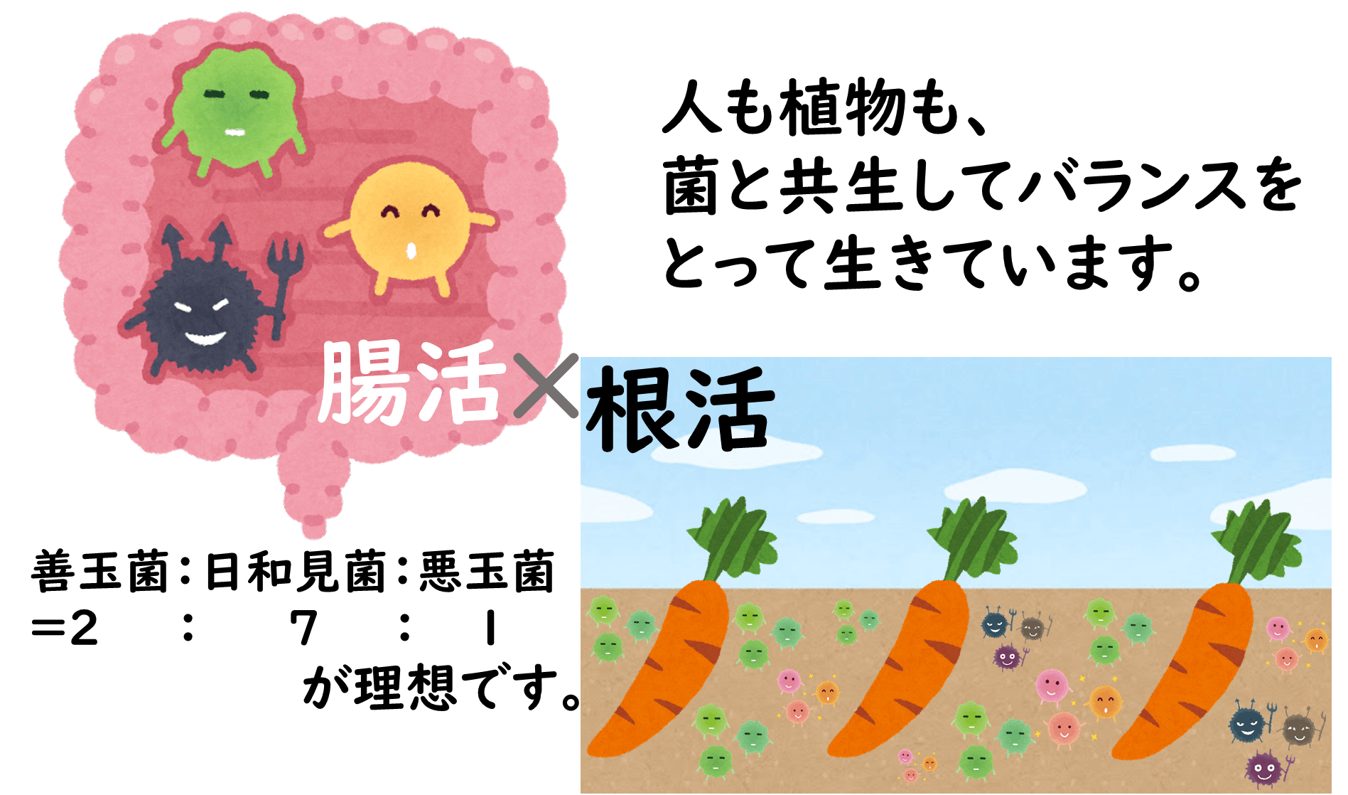 人間が美しく健康になるために腸活を行い普段から腸内細菌叢(フローラ)を整えている方も多いですが、同じ生物である植物にとっての腸は根であり、植物の根と土壌菌や微生物との関係(根活)が非常に大事であると考えております。