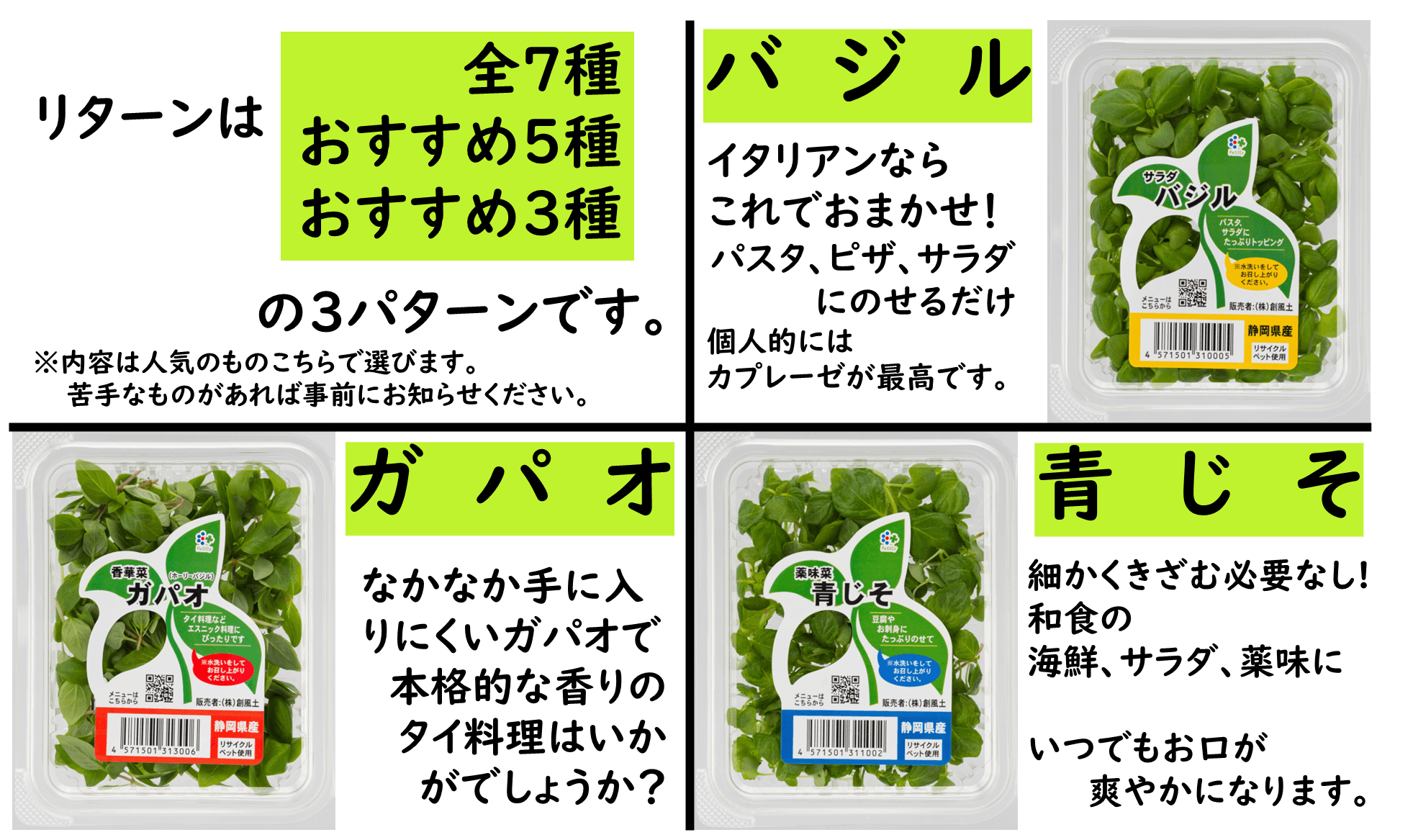 おすすめ5種や、おすすめ3種はその中より人気の高い種類を厳選して発送します。
