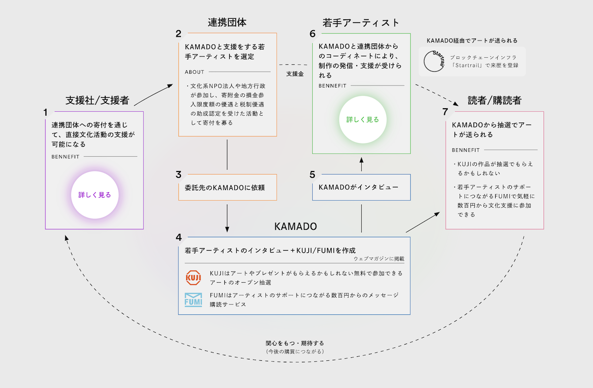 KAMADOは全てのステークホルダーとやり取りをし、連携団体(NPO法人・地方行政)と各プロジェクトの立ち上げ、法人企業へプロジェクトの紹介、進行管理、アーティストのインタビュー記事制作、読者への発信・PR、KUJI作品展示のやり取り、読者へKUJI作品譲渡後のNFT(ブロックチェーン)管理を行います。プロジェクト支援後に法人企業とアーティストがコラボレーションする場合はディレクターを紹介する事も行ってます。