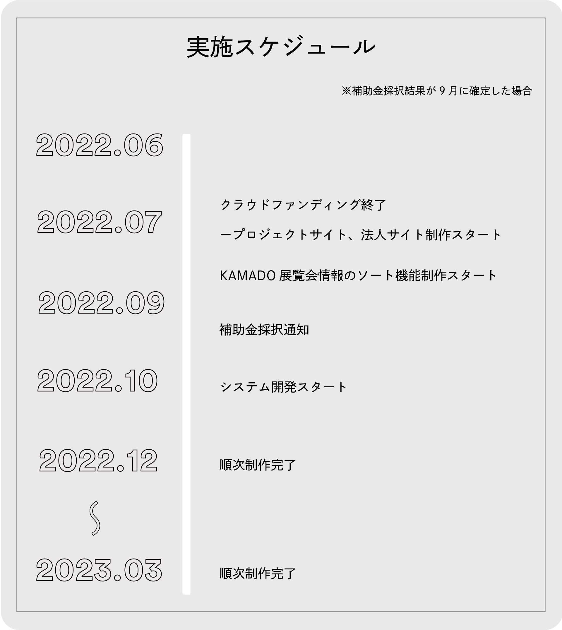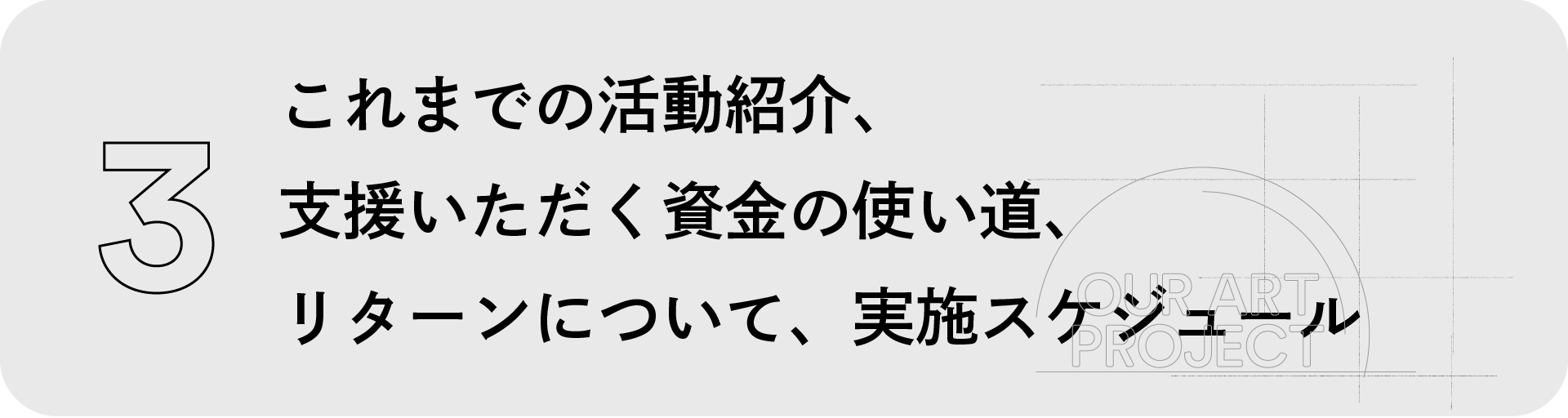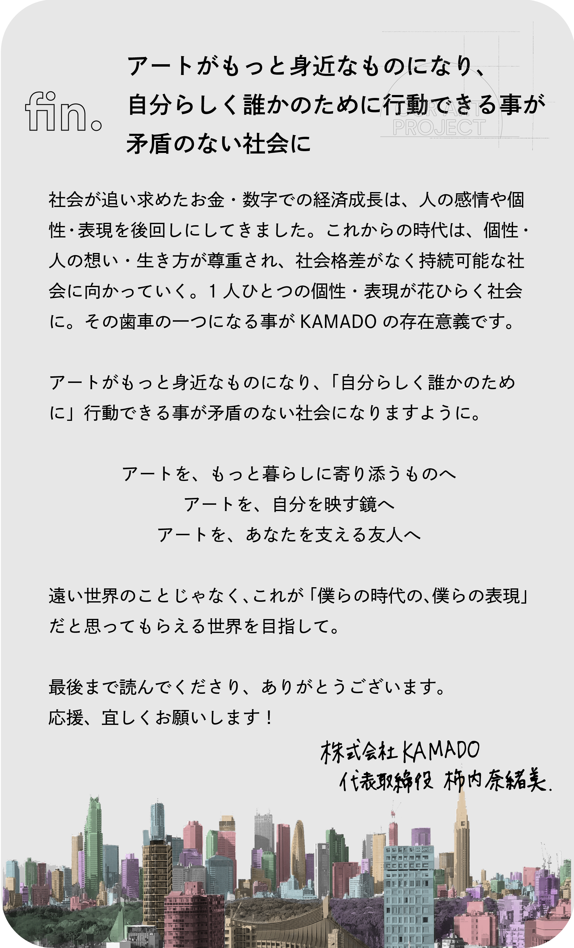 今回のクラウドファンデイングでは、KAMADOが運営するOUR ART PROJECTのウェブ/システム開発・営業・PRの強化を行い、更にプロジェクト数を増やしアートを社会へ広めていく為の資金調達。そしてこのプロジェクトにご賛同いただける仲間を増やしたい想いで実施します。