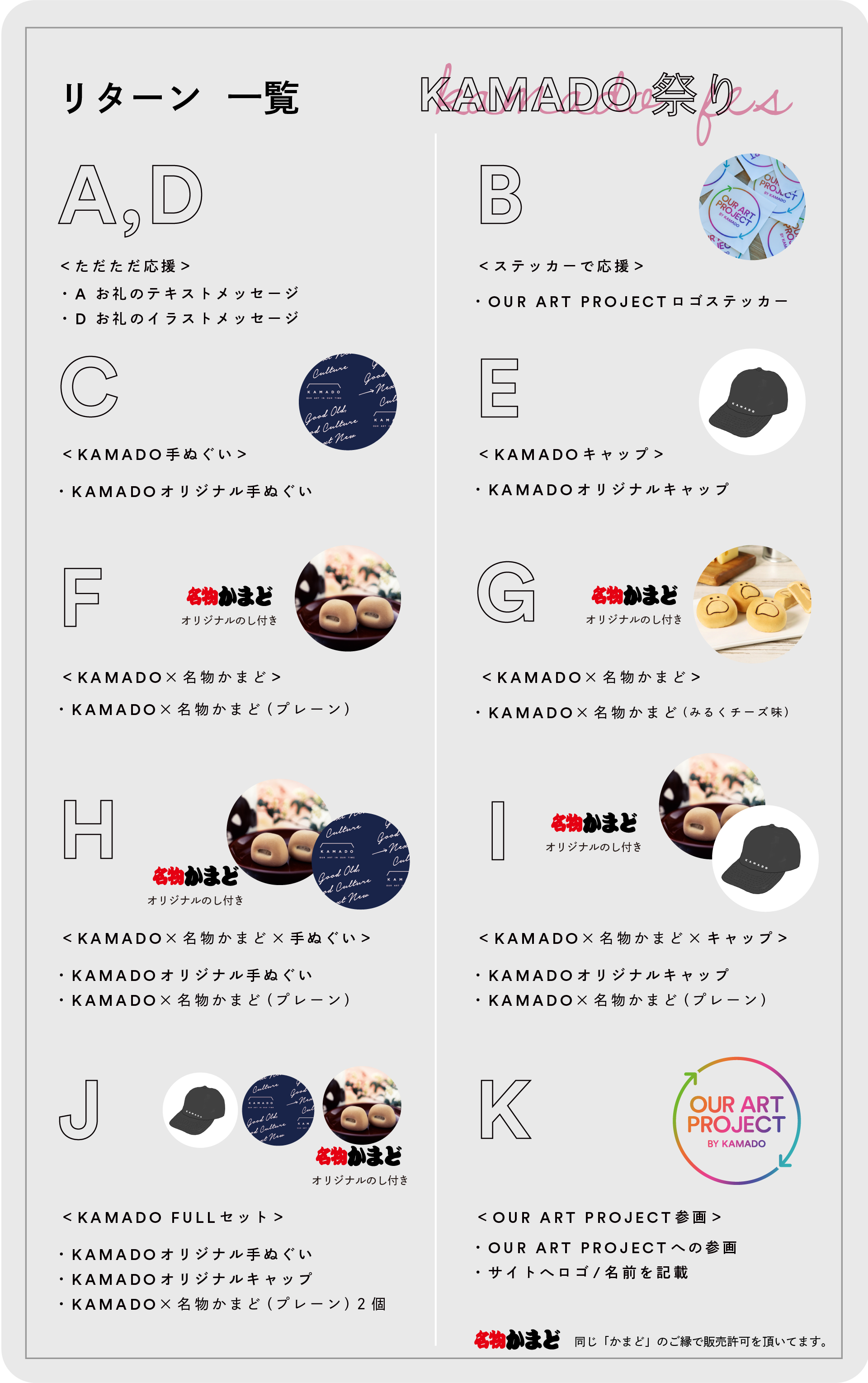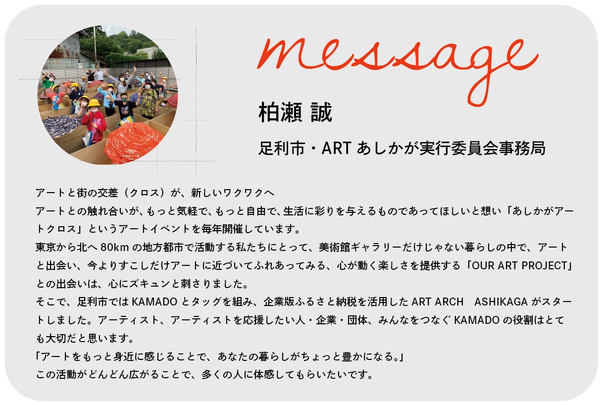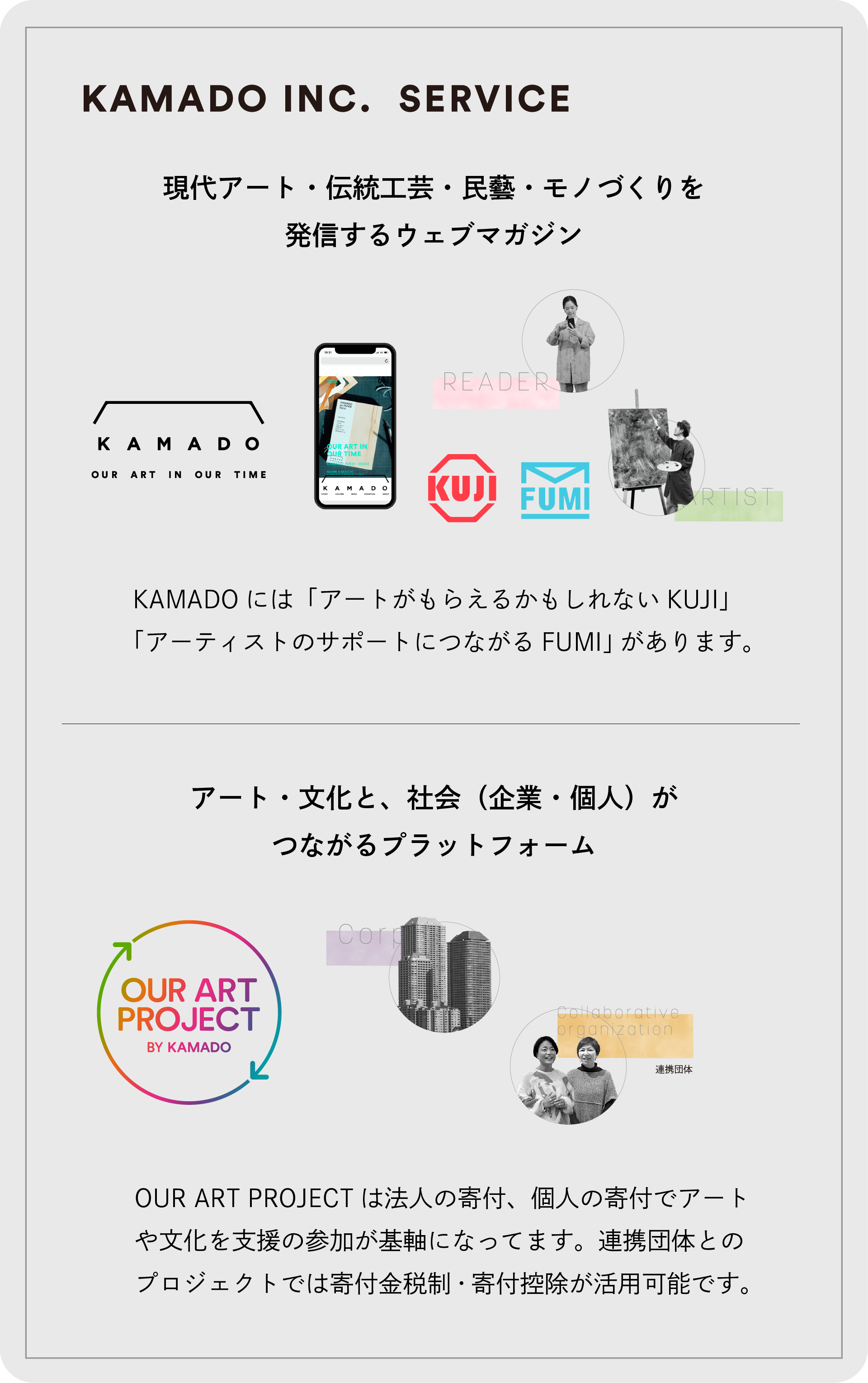 OUR ART PROJECTは、みんな(OUR)で、誰もがアートにふれる機会を作っていく為、多くの方々に関わって頂いてます。それは、法人企業、KAMADOと連携するNPO法人や地方行政、若手アーティスト・作家、そして、KAMADOの読者です。