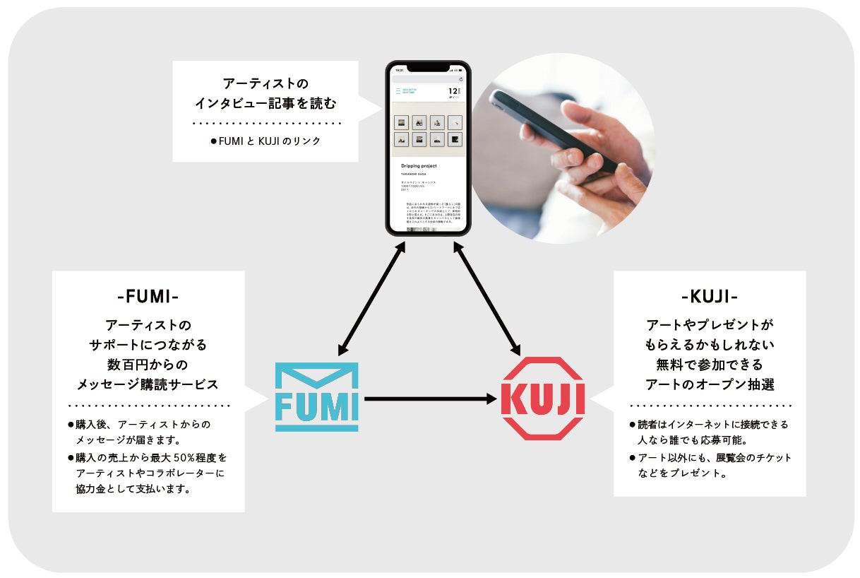 ウェブマガジンの読者は記事コンテンツや展覧会情報を楽しみつつ、若手アーティストのインタビューを読み、「アートがもらえるかもしれないKUJI」とその「アーティストのサポート(アーティストが制作したデジタル葉書を購入することで支援)につながるFUMI」への参加で一方的ではない繋がりを持つことができます。