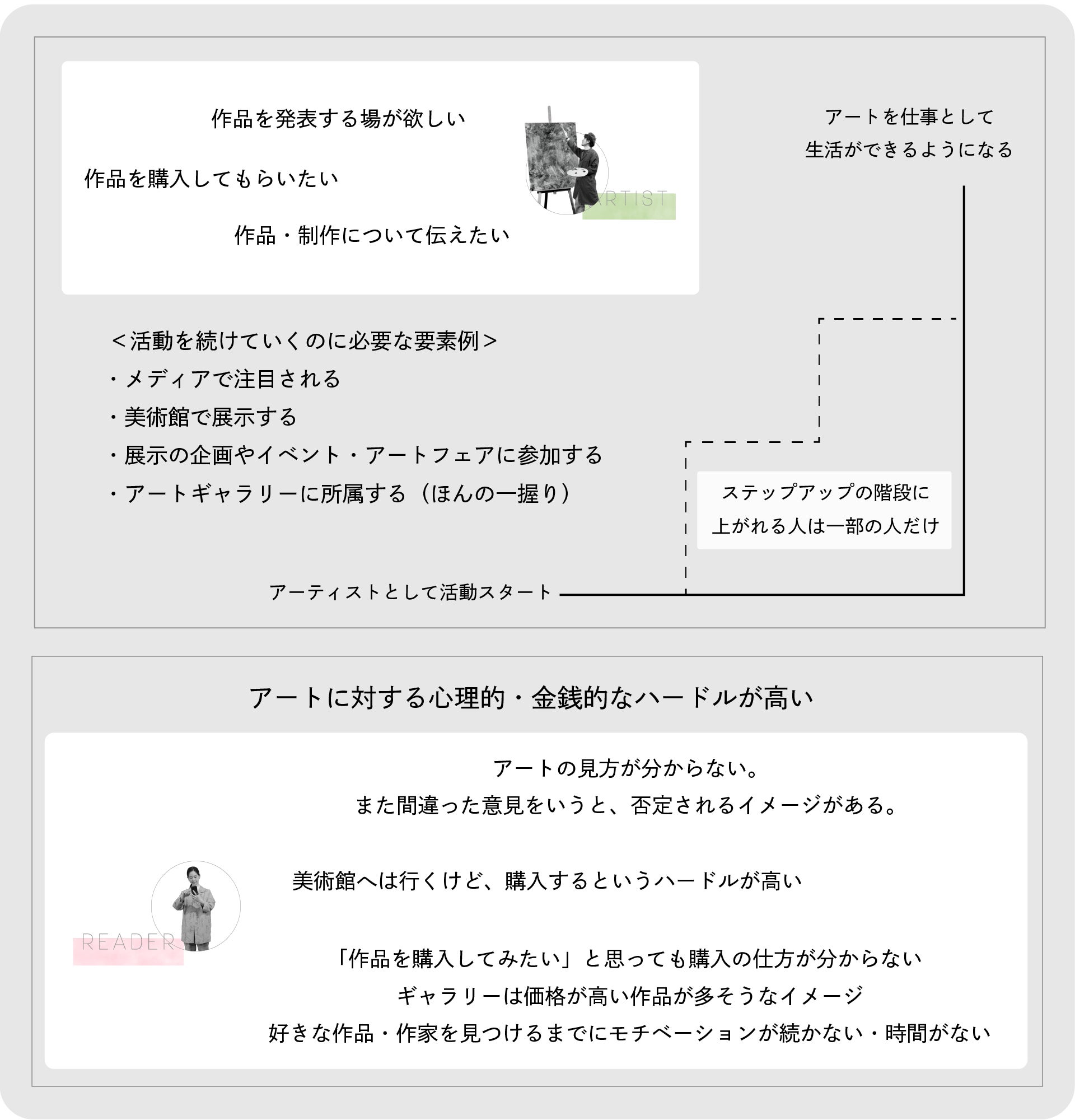 多くのアーティストは別の仕事をしながら自費で個展やグループ展を開催し、アワードに応募・企画に参加といった作品発表の固定化の中で作品の販売・認知を広げていってます。ですが日本はそもそもアートを楽しむ人もアートを購入する人の母数が少ないです。