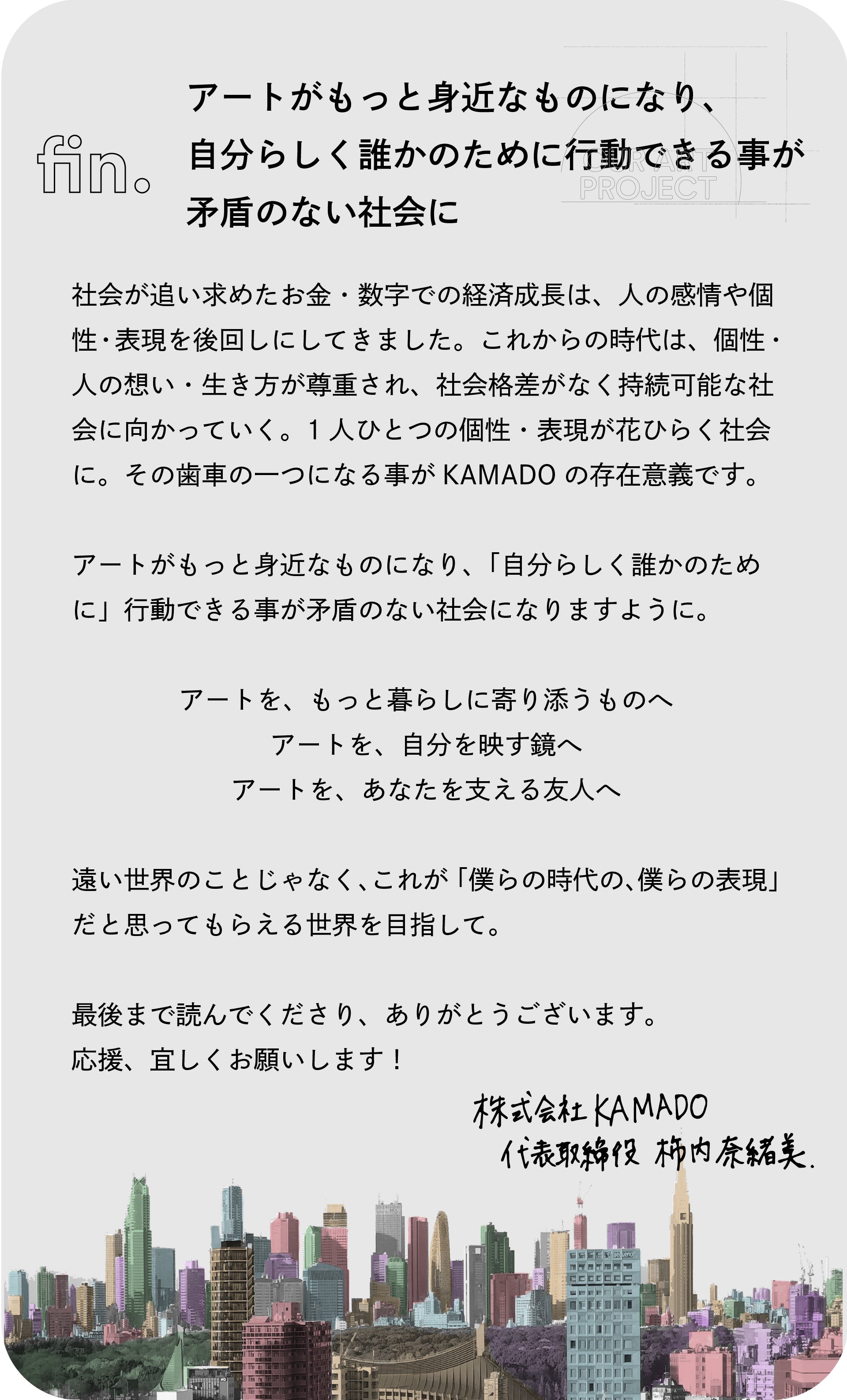 これらの課題をすこしでも解決し、「支援ときっかけを得て、活動に広がりを持つアーティストを増やす」「アートにふれる事へのきっかけをつくり、心が動く楽しみを体験できる人達(企業・個人)を増やす」のがKAMADOの役割です。