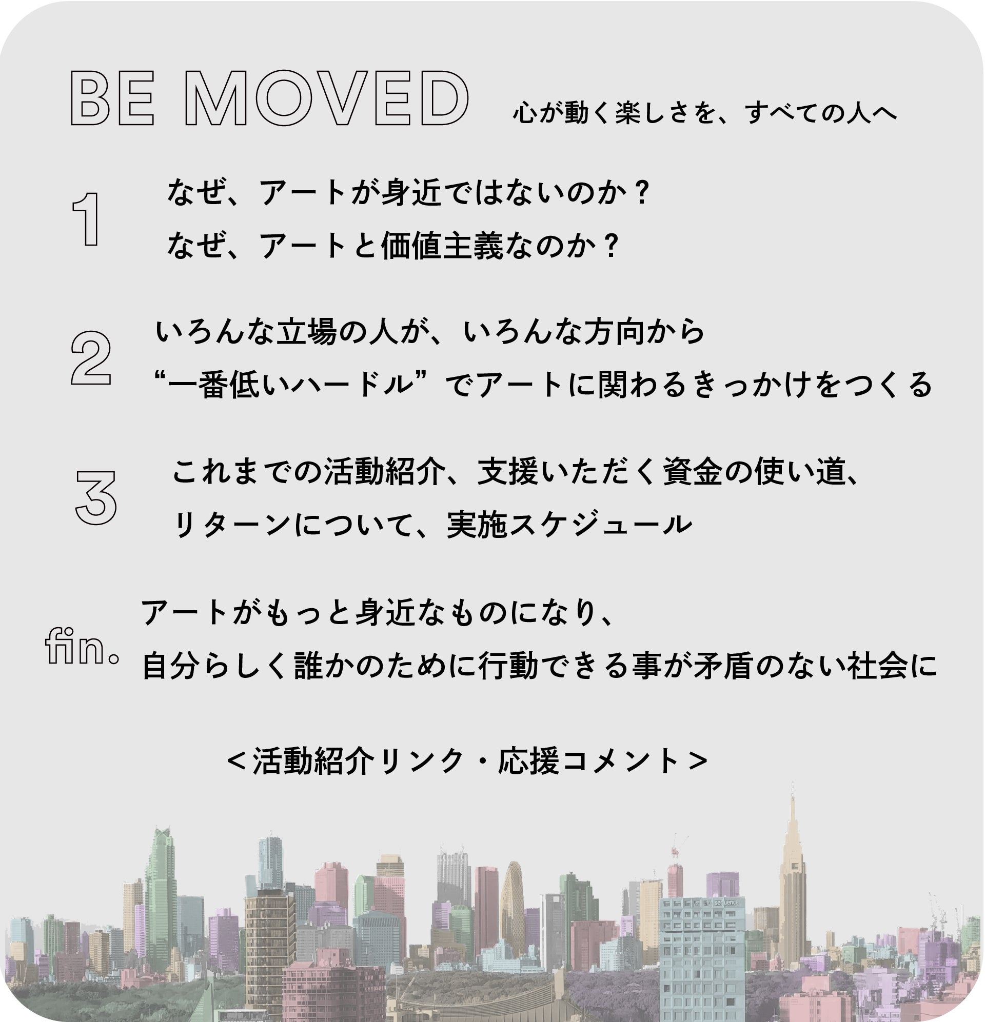 「広く活動を知ってもらいたい若手アーティスト」と、「アートに興味はあるけどすこし壁を感じている人たち(企業・個人)」がオンラインとリアルでつながり、小さく確実なきっかけを街中や地方、日本中にたくさん作ることを目標にしてます。