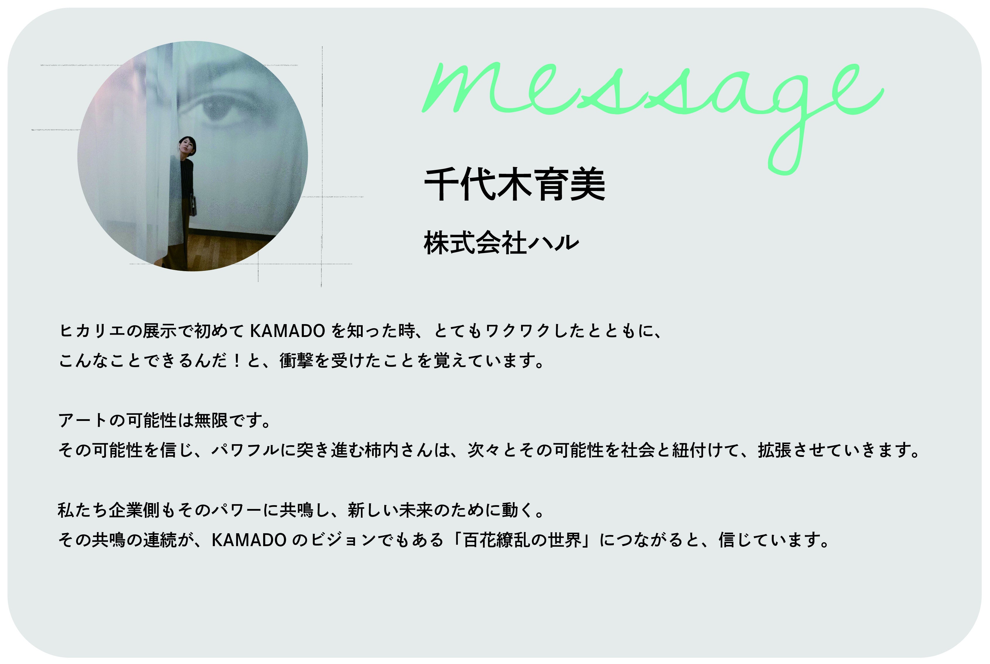 2022/06/13 11:002020年8月末に開催したヒカリエの展示で知り合ってから、セミナーに登壇させて頂いたりとお世話になっている株式会社ハルの千代木さんから応援コメントをいただきました。ヒカリエの展示で初めてKAMADOを知った時、 とてもワクワクしたとともに、 こんなことできるんだ!と、 衝撃を受けたことを覚えています。 アートの可能性は無限です。 その可能性を信じ、 パワフルに突き進む柿内さんは、 次々とその可能性を社会と紐付けて、 拡張させていきます。 私たち企業側もそのパワーに共鳴し、 新しい未来のために動く。 その共鳴の連続が、 KAMADOのビジョンでもある 百花繚乱の世界につながると、信じています。 もっと見る