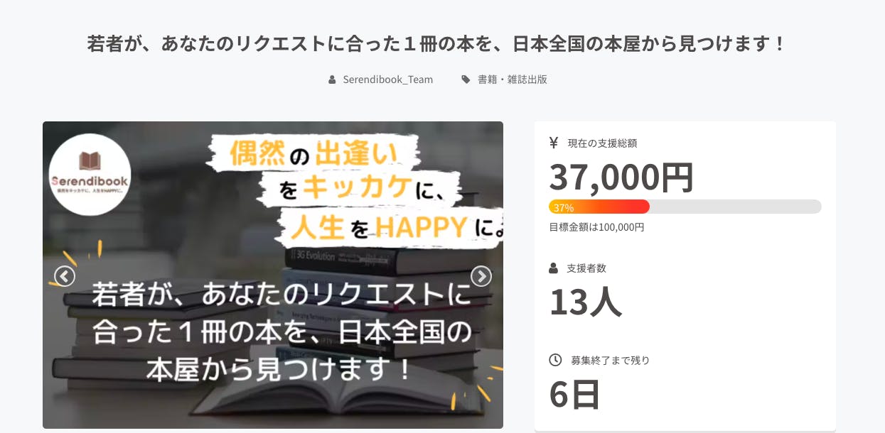 10代~20代の若者がアナタの気持ちからさまざまなことを連想し、日本中の本屋さんを巡り、カンや想像を頼りに偶然にも出逢いピンときた本をお届けする取り組み、「Serendibookプロジェクト」がクラウドファンディングにて開始してから早14日が経過し、いよいよ終了まで【残り6日】になりました!
