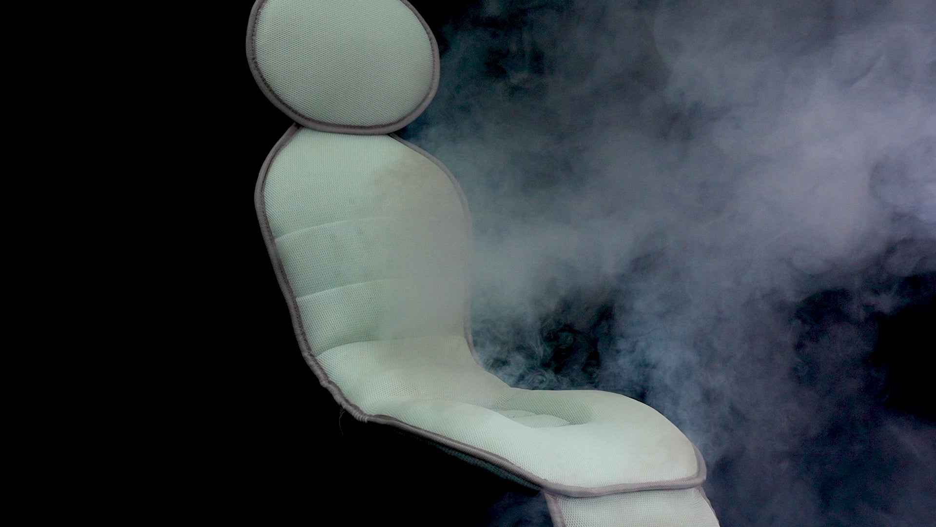 シート下部の高速ファンが周りの空気を取り込み、シート全体にその空気を送り込みます。