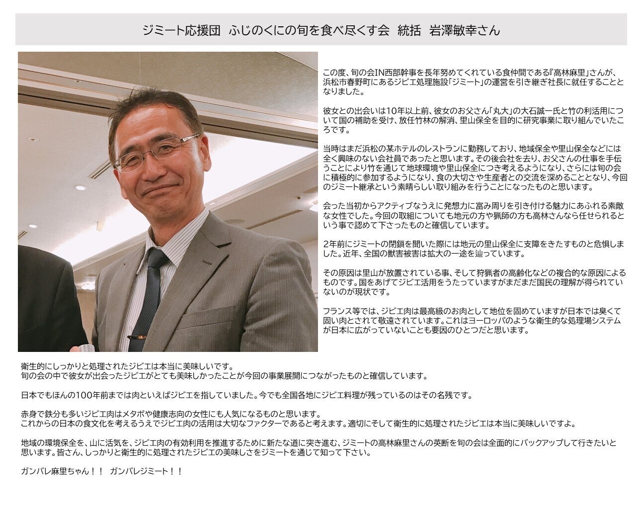 ジミートが復活することにより、殺処分ではなく、動物同士が食べる為に捕獲するように、私たちも肉は食べて、内臓や角はペットフードに、皮は革製品にして、すべてを有難く頂き、里山が代々受け継いでいる「共存」していく文化を継承していきたいと思っています。