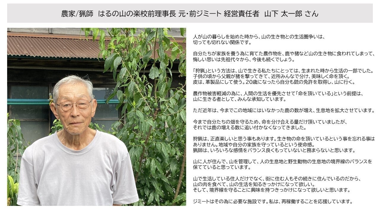 ジミートが復活することにより、殺処分ではなく、動物同士が食べる為に捕獲するように、私たちも肉は食べて、内臓や角はペットフードに、皮は革製品にして、すべてを有難く頂き、里山が代々受け継いでいる「共存」していく文化を継承していきたいと思っています。
