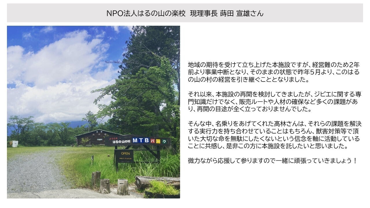 また、この施設をきっかけに、地域の飲食店に地域性のある共通食材で「町おこし」の1つになったり、若い世代に、里山暮らしの魅力を伝える1つの要素になり、移住してくれたら嬉しいと思っています。