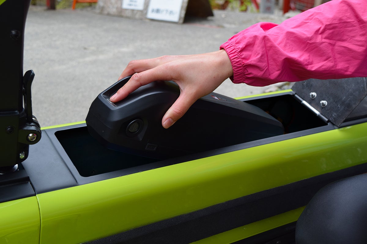 車体からバッテリーを取り外して充電することが可能なので、車体ごと家の中に入れて充電する必要がありません。