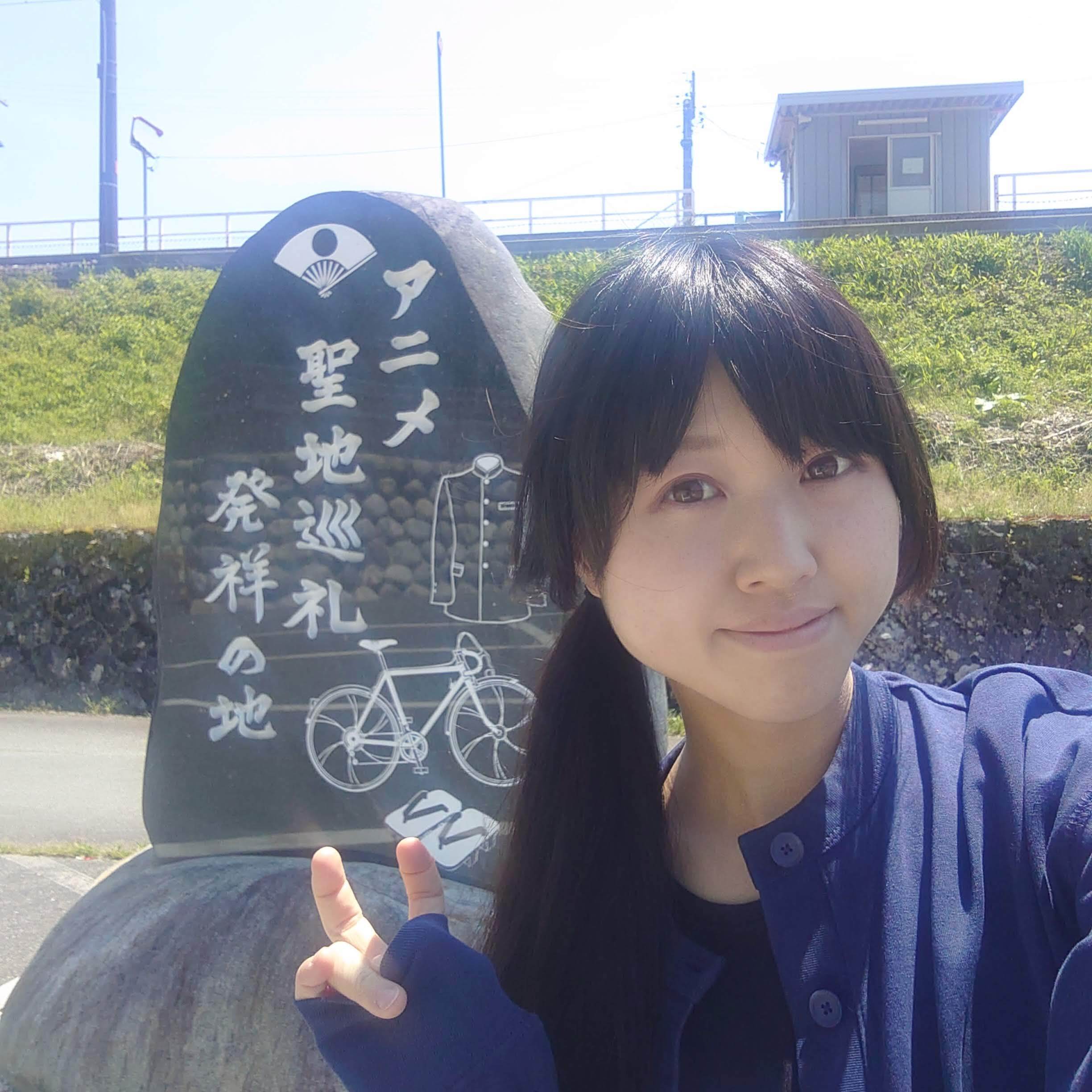 飯島町のJR田切駅前「アニメ聖地巡礼発祥の地」石碑にて