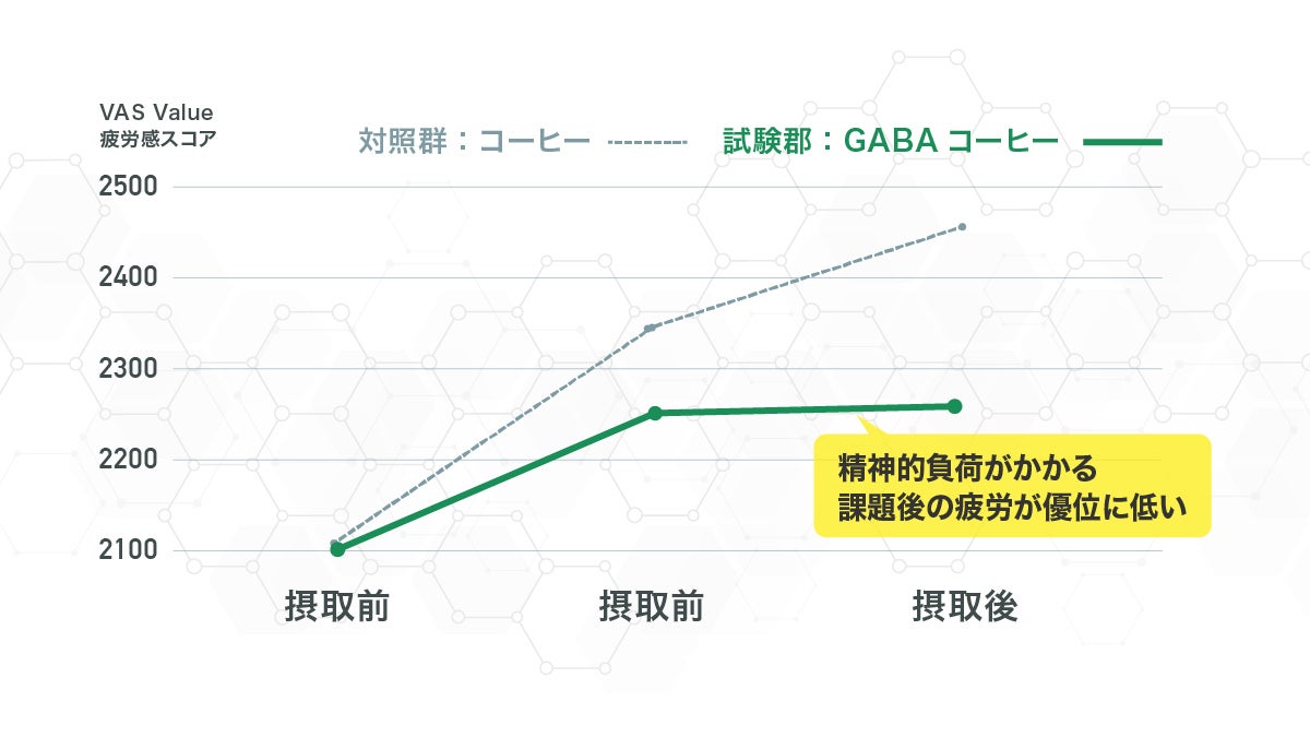 結果:GABA28mgを含むコーヒー飲料を単回摂取し、精神的ストレスがかかる作業負荷後の疲労感VASを評価。精神的負荷がかかる課題後の疲労がGABA摂取群は優位に低い事が確認された。
