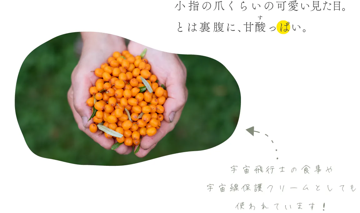 小さな実からは想像できないほどすっぱい小指の爪ほどの実は、レモン等とはちがうリンゴ酸のさわやかな酸味が特徴です。その栄養の豊富さから奇跡の果実と呼ばれ、植物ではマカデミアナッツとシーベリーにしか発見されていない❝パルミトレイン酸❞を含みます。さらに、ノーベル賞授与式の晩餐会に出るなど世界中で利用される理由は、約200種もの栄養素をもつスーパーフルーツだからです。シーベリーの優れた成分や栄養素、おいしさの魅力をなんとかこの日本でも広め、皆様へ知っていただきたいと思っています!