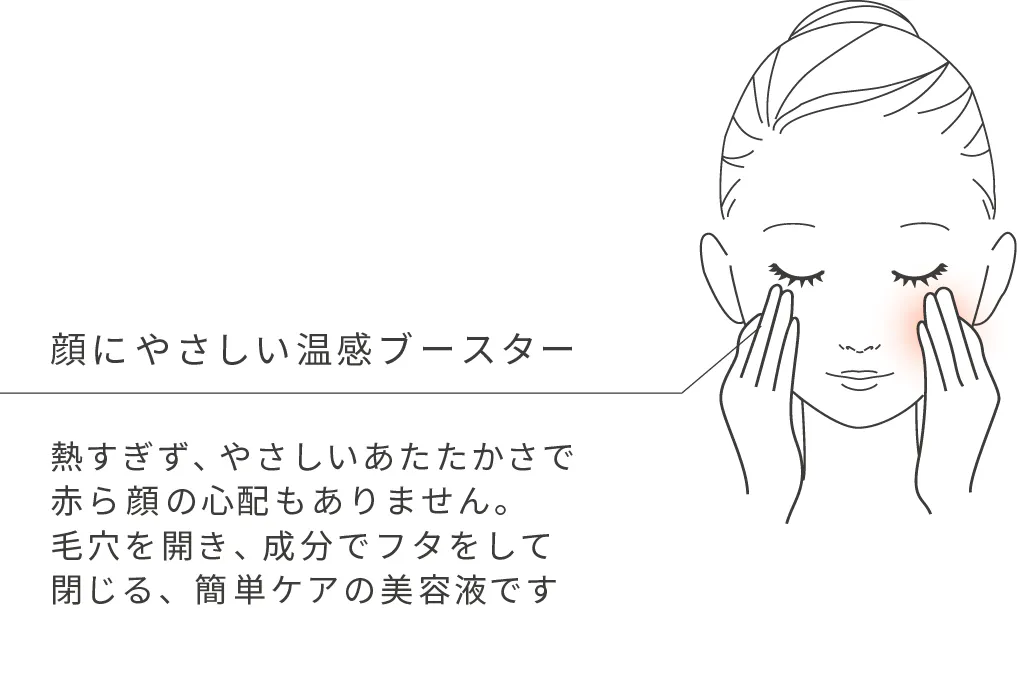 じんわりとあたたかさを感じられるほどの温感ブースターが使用直後から皮膚温度を高め、毛穴を開いて美容成分を浸透しやすくさせます。また、お顔に使用することが多い美容液なのでゆるやかな温かさに調整しました。