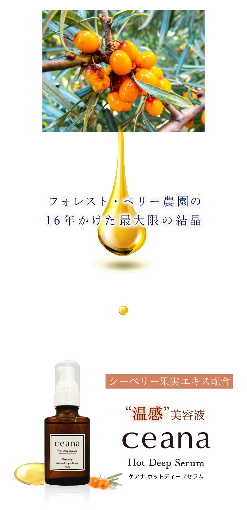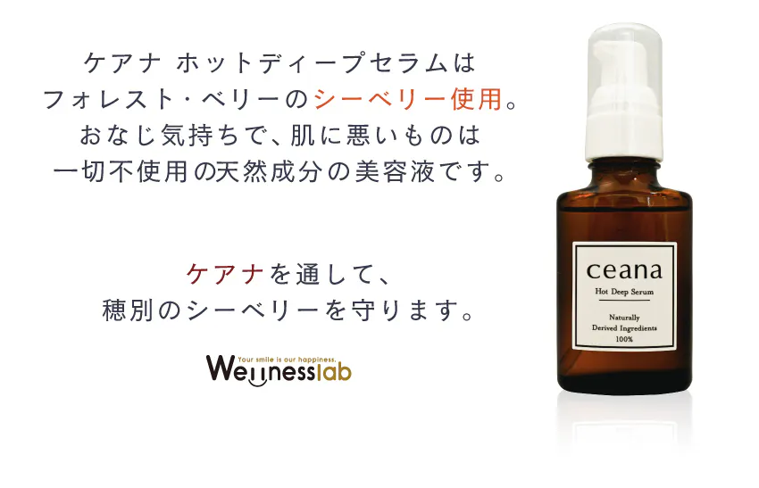 フォレスト・ベリー農園のシーベリーは完全自然栽培の国産であり、一番いい品質の低温圧搾法で抽出された一番搾り、かつ純度100%です。高品質なシーベリーを使用することで栄養価や品質が高く、AHA(フルーツ酸)が含まれるので角質ケアやトラブルが気になる方、ピーリング効果が期待できます。シーベリーを配合したケアナホットディープセラムはあらゆる方に安心してお使いいただけます。乾燥から守り、保湿しつつ年齢サインに集中的にアプローチ。あらゆる肌の悩みからキレイを目指す女性たちを応援するシーベリーだからこそ、美容液にしました。