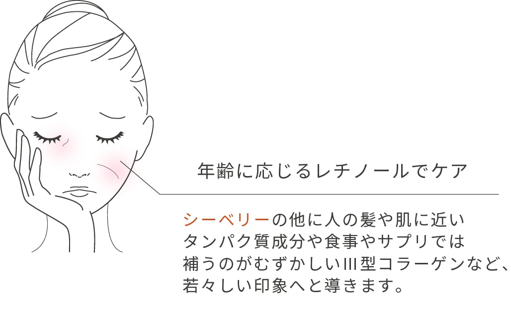 フォレスト・ベリー農園のシーベリーは完全自然栽培の国産であり、一番いい品質の低温圧搾法で抽出された一番搾り、かつ純度100%です。高品質なシーベリーを使用することで栄養価や品質が高く、AHA(フルーツ酸)が含まれるので角質ケアやトラブルが気になる方、ピーリング効果が期待できます。シーベリーを配合したケアナホットディープセラムはあらゆる方に安心してお使いいただけます。乾燥から守り、保湿しつつ年齢サインに集中的にアプローチ。あらゆる肌の悩みからキレイを目指す女性たちを応援するシーベリーだからこそ、美容液にしました。