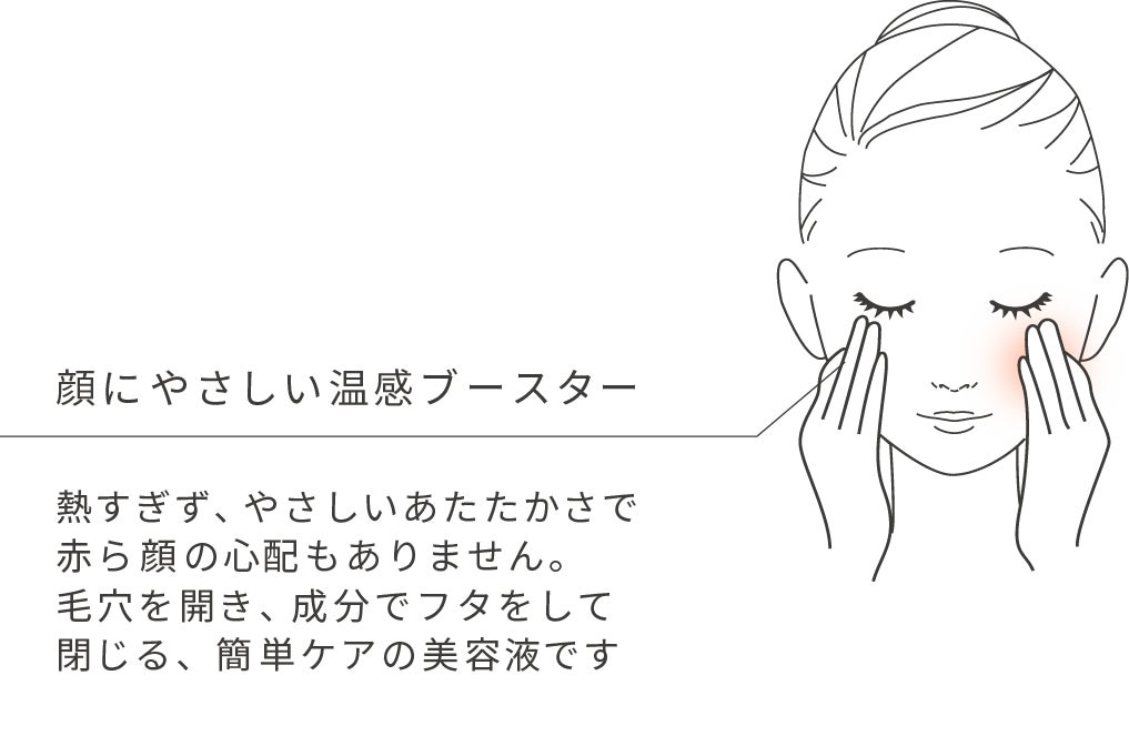 じんわりとあたたかさを感じられるほどの温感ブースターが使用直後から皮膚温度を高め、毛穴を開いて美容成分を浸透しやすくさせます。また、お顔に使用することが多い美容液なのでゆるやかな温かさに調整しました。