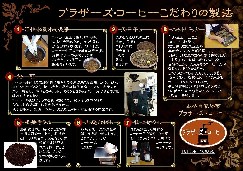 家庭の事情で、鳥取県に暮らしていた時。本プロジェクトのメーカーとなる、知る人ぞ知る名珈琲喫茶として山陰の皆様に親しまれているブラザーズコーヒーと出会いました。ここのコーヒーのえぐみのない美味しさにひかれ、パソコン持参で日参していました。同店のオーナーで焙煎士の松永さんが自社のオリジナルコーヒーを全国に広めたいとの希望に同調し、ぜひともこの美味しさを全国の皆様に知っていただきたい、と同調したのがプロジェクト立ち上げのきっかけとなりました。