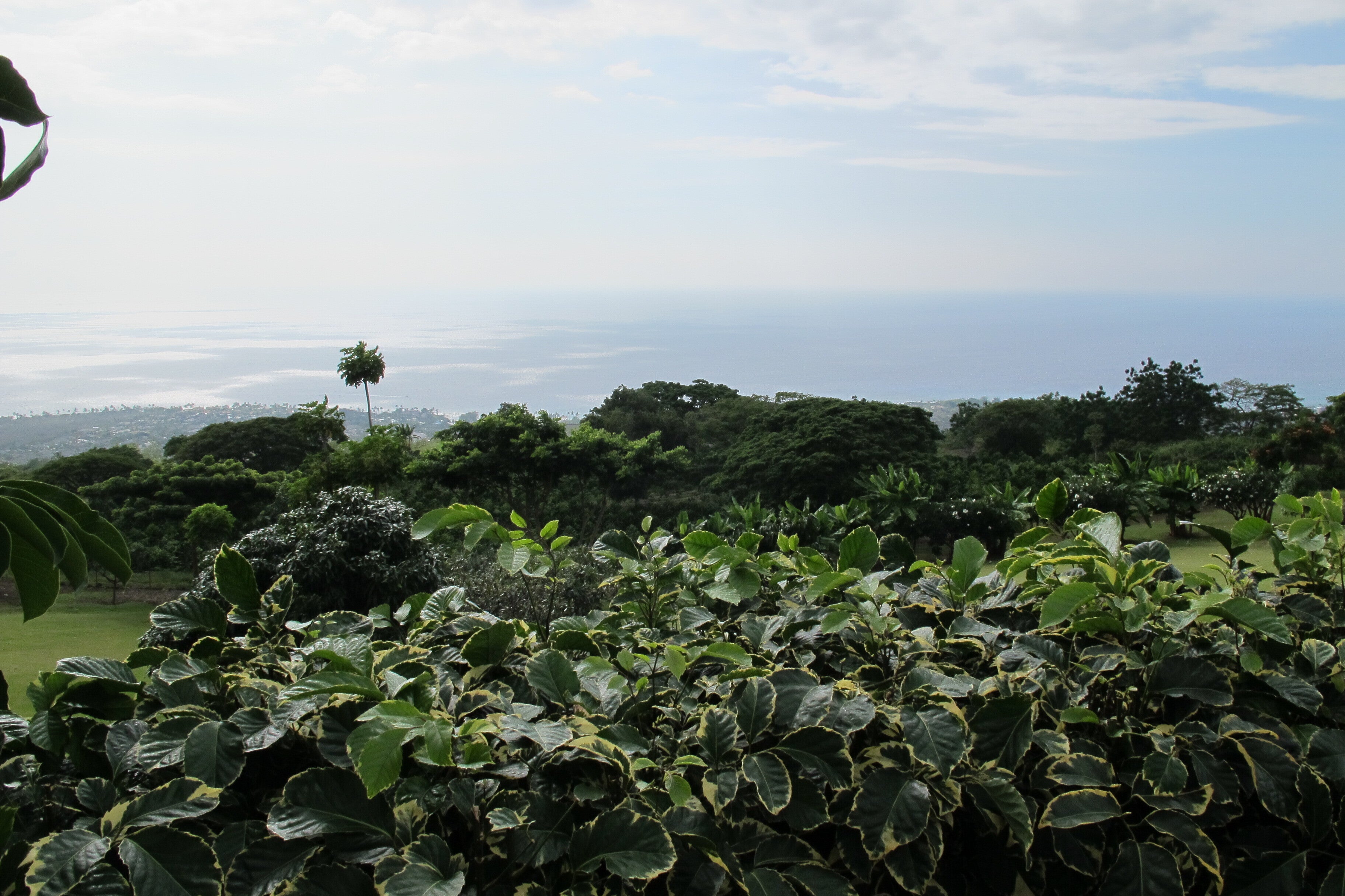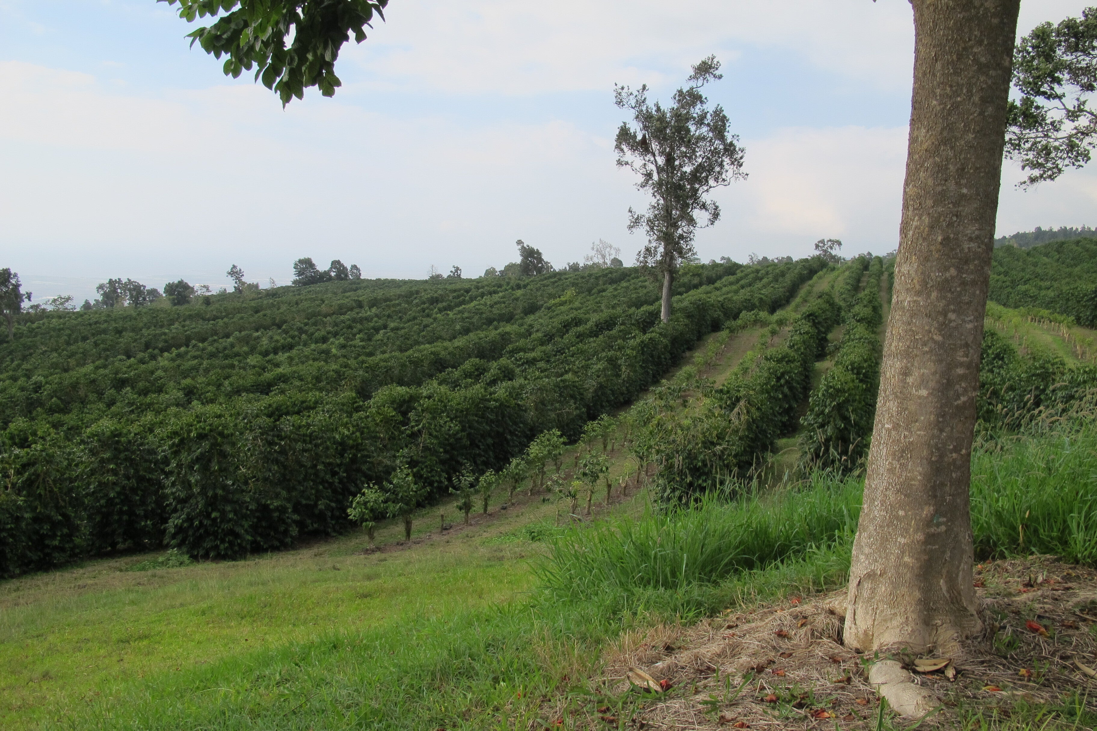 コナ地区は長さ約32km、幅3.2kmのハワイ島の小さな地区。そこで年間90万kgのコーヒー豆が収穫されます。コナの最大の特徴は火山エリアということです。コナ豆は火山灰のミネラルを含む肥沃な土壌によって育ちます。火山と美味しいコーヒー豆には深い関係があります。珈琲畑からのぞむハワイの海