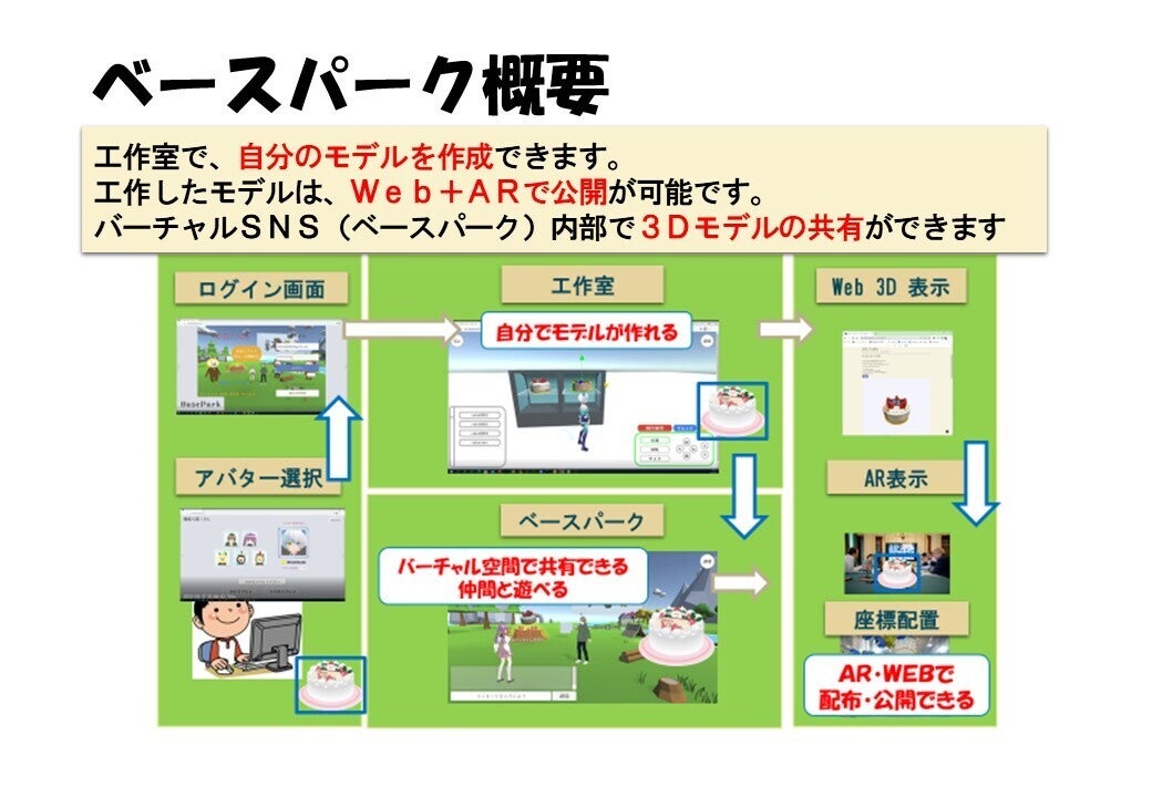 ・自分で作った作品を、バーチャルSNS(ベースパーク)内共有していろいろな人と交流して欲しい。