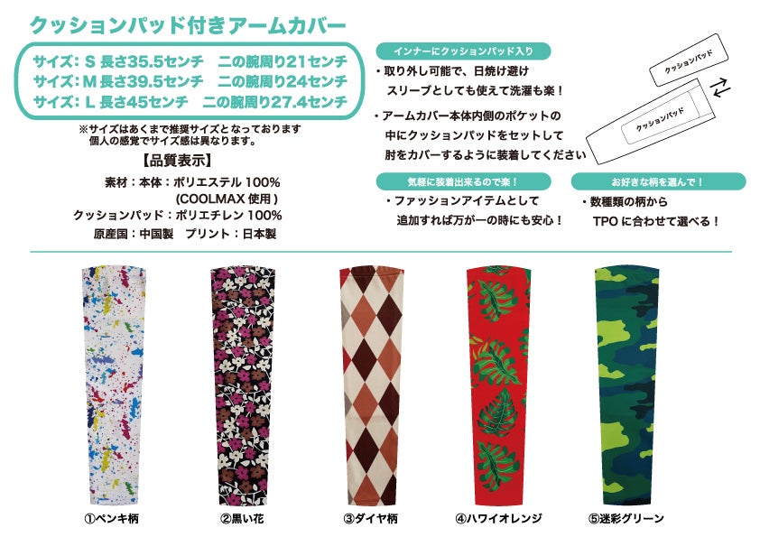 『アームカバー』のバリエーションは5柄をご用意させていただきました。