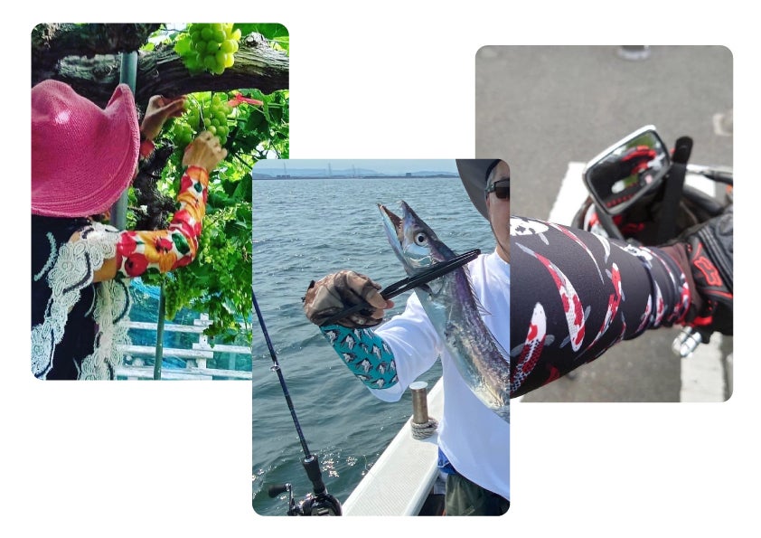 (岡山にある船穂ワイナリー様にて収穫・仕込みのお手伝いのお写真(左)、釣りに行った時のお写真(真ん中)、バイクに乗った時のお写真(右)ともに第1回クラウドファンディングにてご支援いただきました『TRUERAISE トゥルーレイズ』を付けて撮影してくださいました。実際にご使用いただいた感想は、〈肌触りもよく洗濯もさくさく洗えてシワにならない〉、〈作業で肘を付くときに痛くない〉、〈お洒落で楽しい気分にもなり重宝している〉など嬉しいお言葉をいただきました。