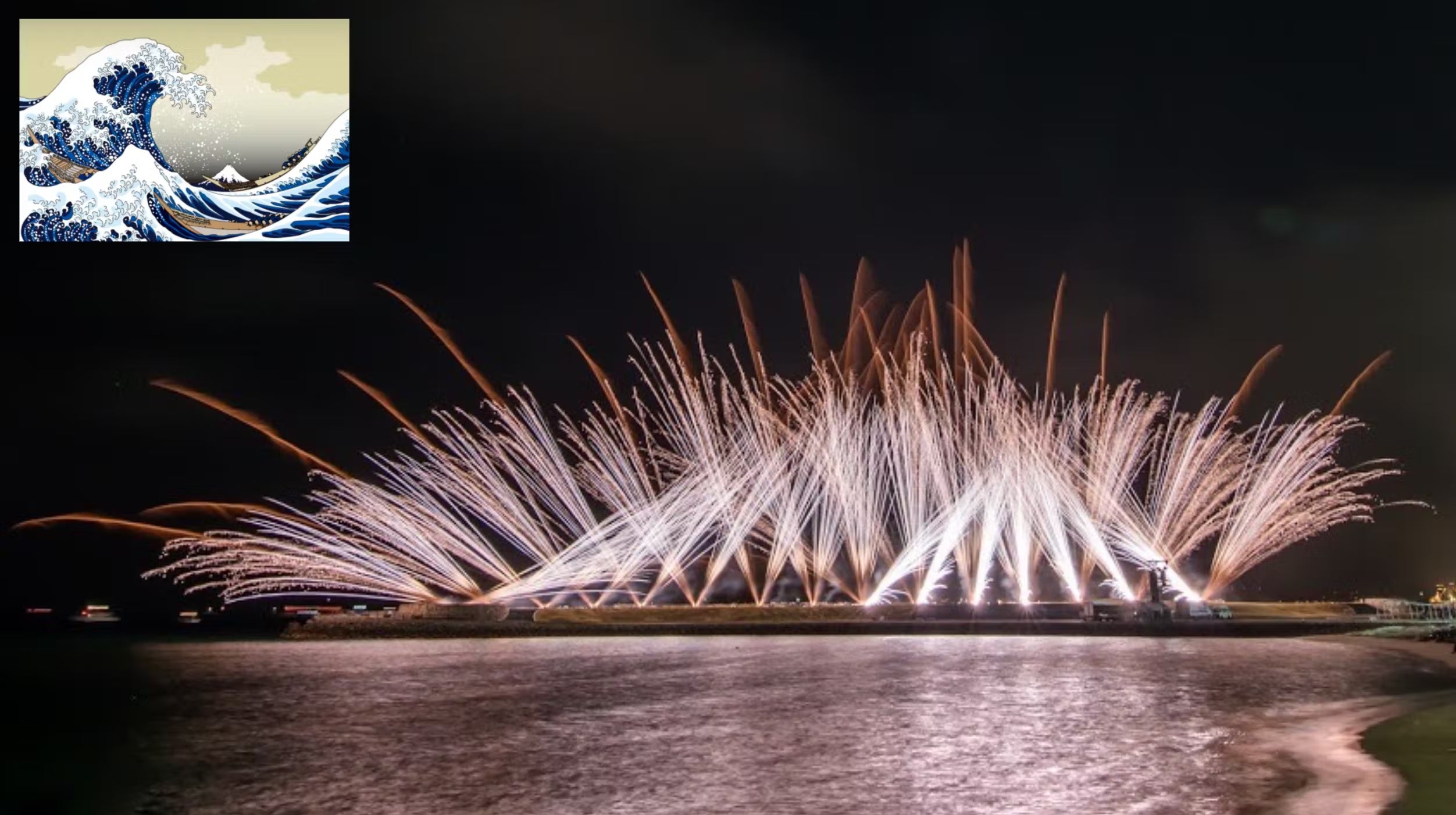Fireworks express the movement of waves, splashes, and Mt. Fuji drawn in "KANAGAWA OKI NAMIURA", a masterpiece of ukiyo-e artist Katsushika Hokusai.