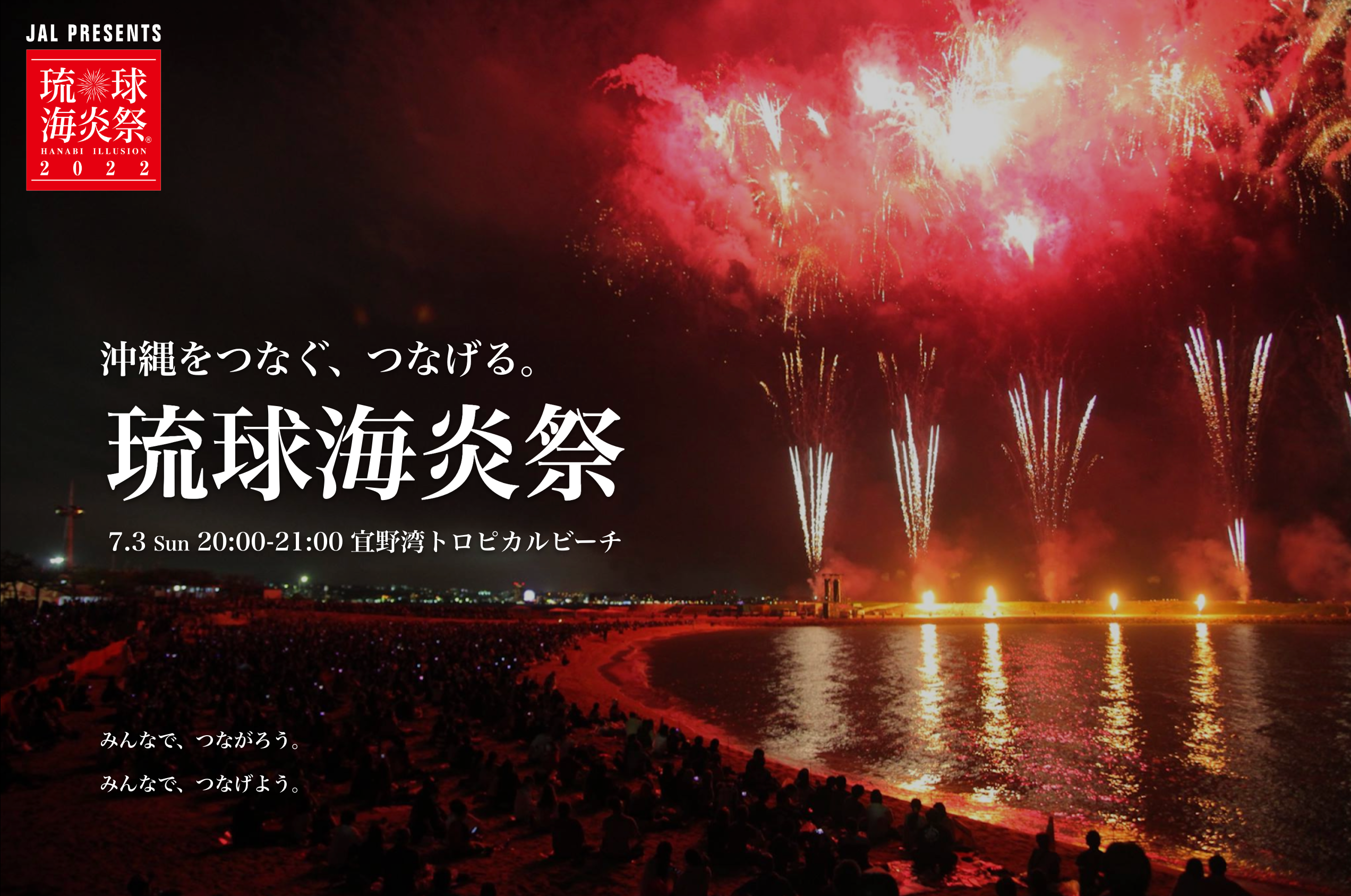 尽管由于新型冠状病毒肺炎 (COVID--19) 疫情的影响,琉球海炎节举步维艰,但我们举办2022年琉球海炎节的原因是,我们相信“烟花”的力量照亮了夜空。现在,想要向下的日子还在继续,但是烟花有向上的力量。我认为还有能力使冲绳县的旅游产业,食品和饮料产业以及许多公司向上发展。我希望能与热爱冲绳的人们一起,在夜空中燃放烟花,从而渡过难关。最后,请务必支持和合作。现在,要把心放在一起。大家一起连接吧。