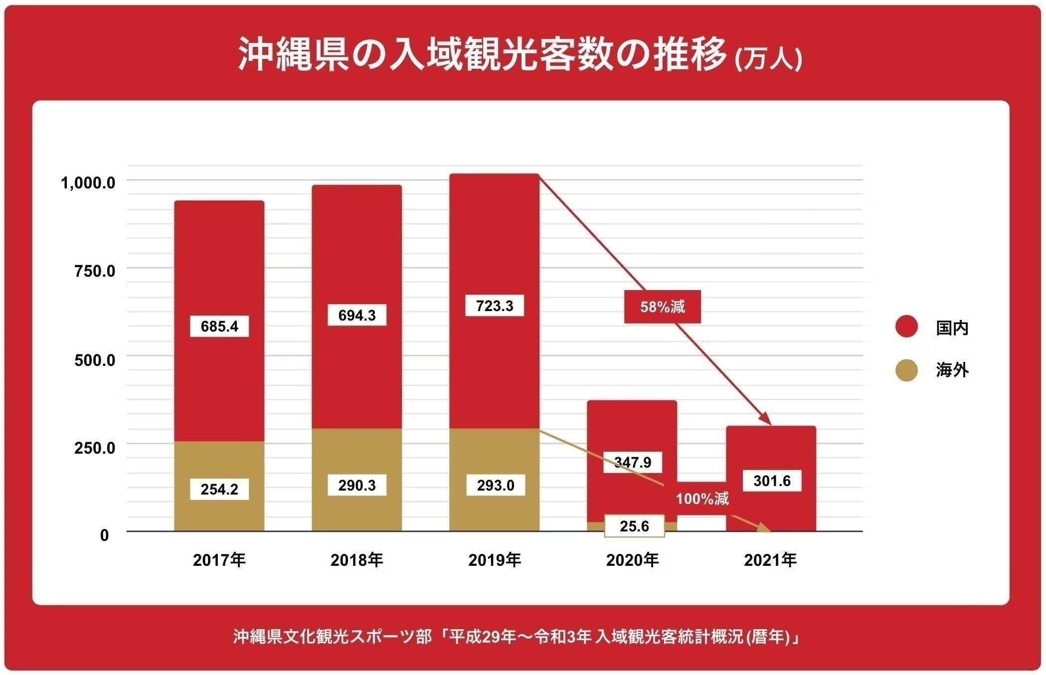 오키나와현을 방문하는 관광객은 2019년까지 증가하고 있으며, 2019년 관광객 수는 1년간 1000만 명을 넘었습니다. 그러나 오키나와현을 방문하는 관광객은 COVID-19의 영향으로 감소했습니다. 그리고 2021년에 오키나와현을 방문하는 외국인 관광객은 0명이 되었습니다.