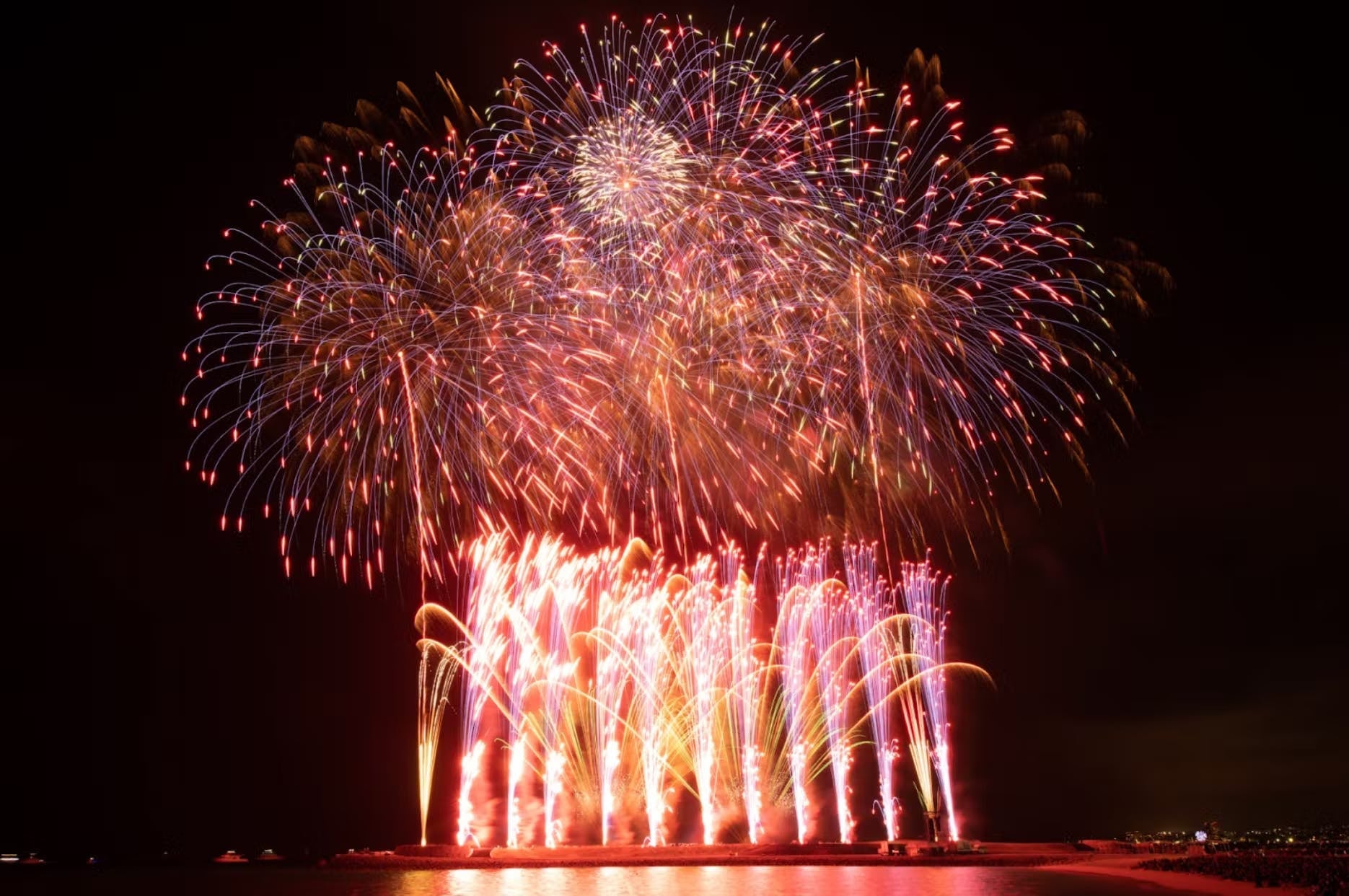 우키요에사·카츠시카 호쿠사이의 대표작 「KANAGAWAOKI NAMIURA」로 그려진 파도의 움직임, 물보라, 후지산을 불꽃으로 표현합니다. HOKUSAI KATSUSHIKA는 미국 잡지 'LIFE'에서 '이 1000년에 가장 공적을 남긴 세계 인물 100명'으로 선출되었습니다.