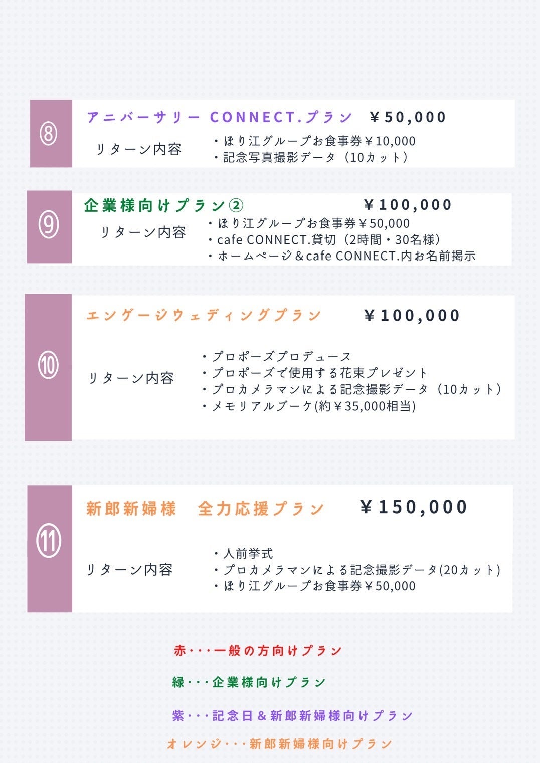 有限会社ほり江の全店舗でお使い頂けるお食事券のついたリターンや、これから結婚を控えた方に向けたお得なリターンなどお選び頂けます。