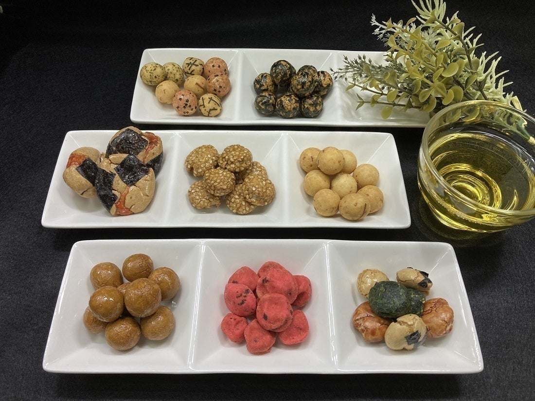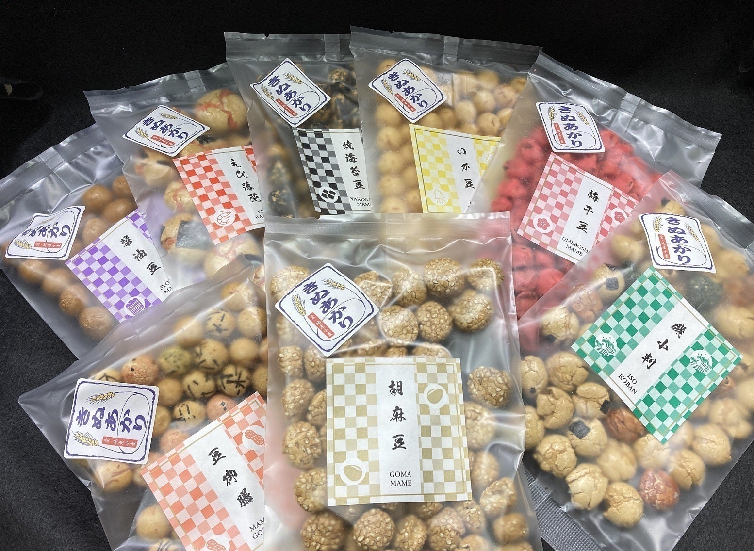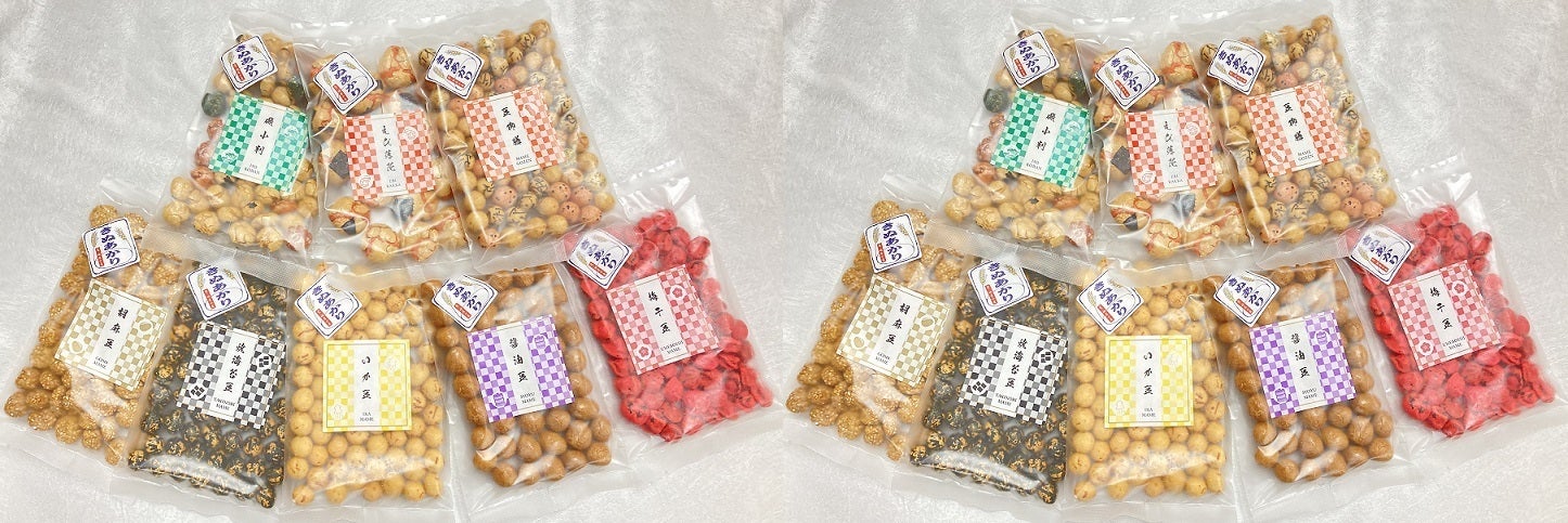 左から、えび落花、磯小判(刻海苔・醤油・青海苔)、胡麻豆、梅干豆、いか豆、醤油豆、豆御膳(エビ・刻海苔・青海苔・いか)、焼海苔豆。
