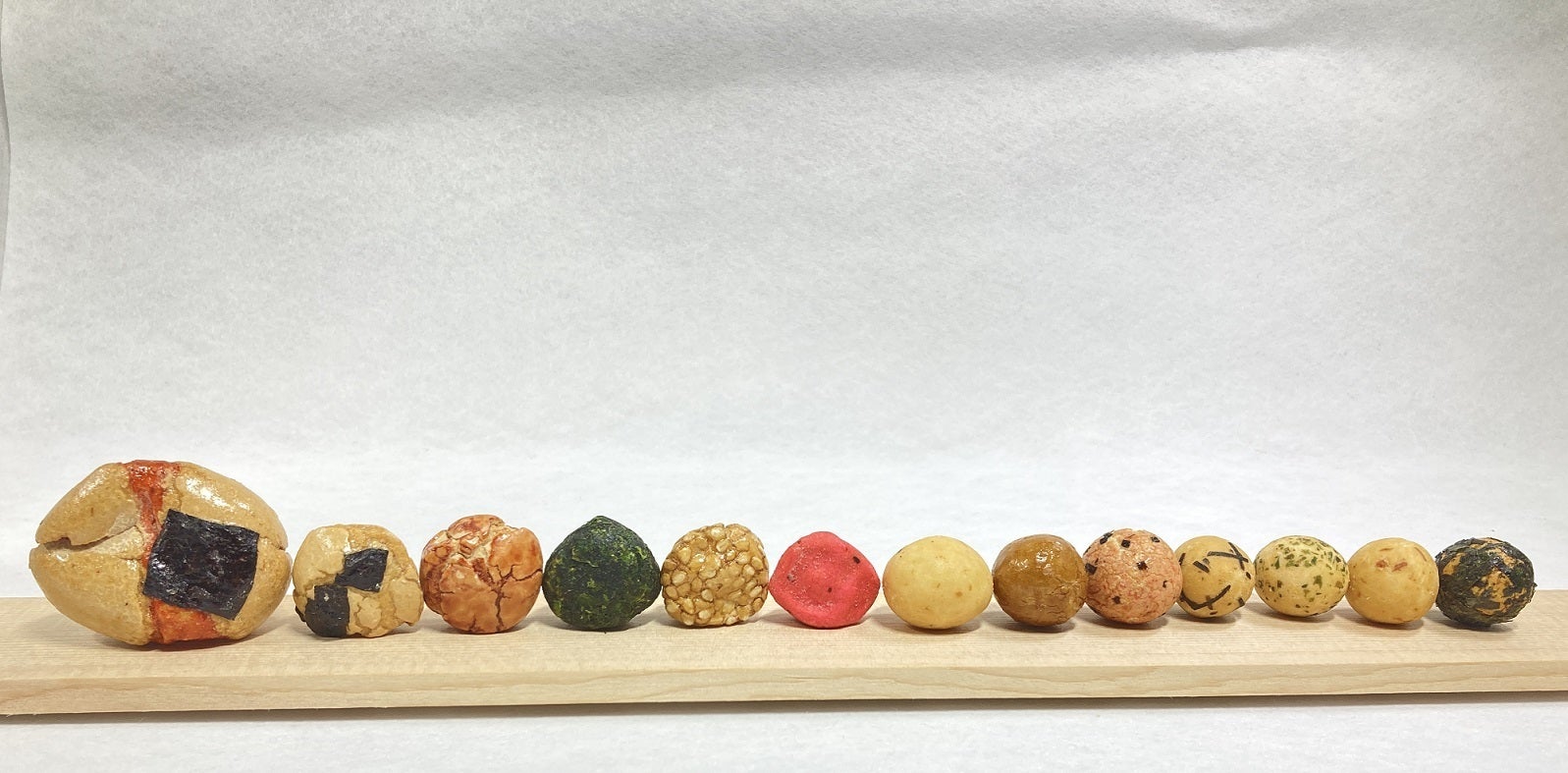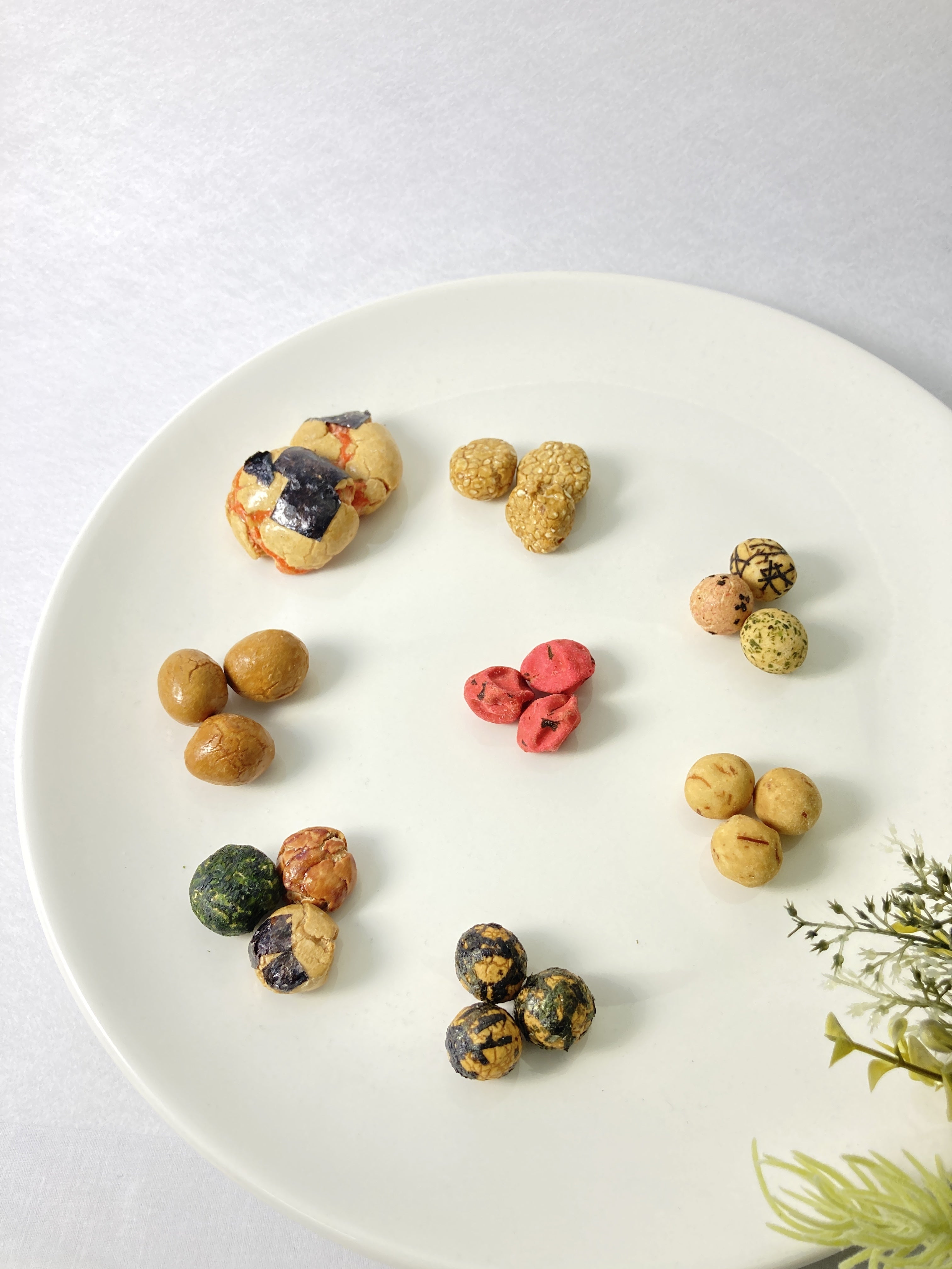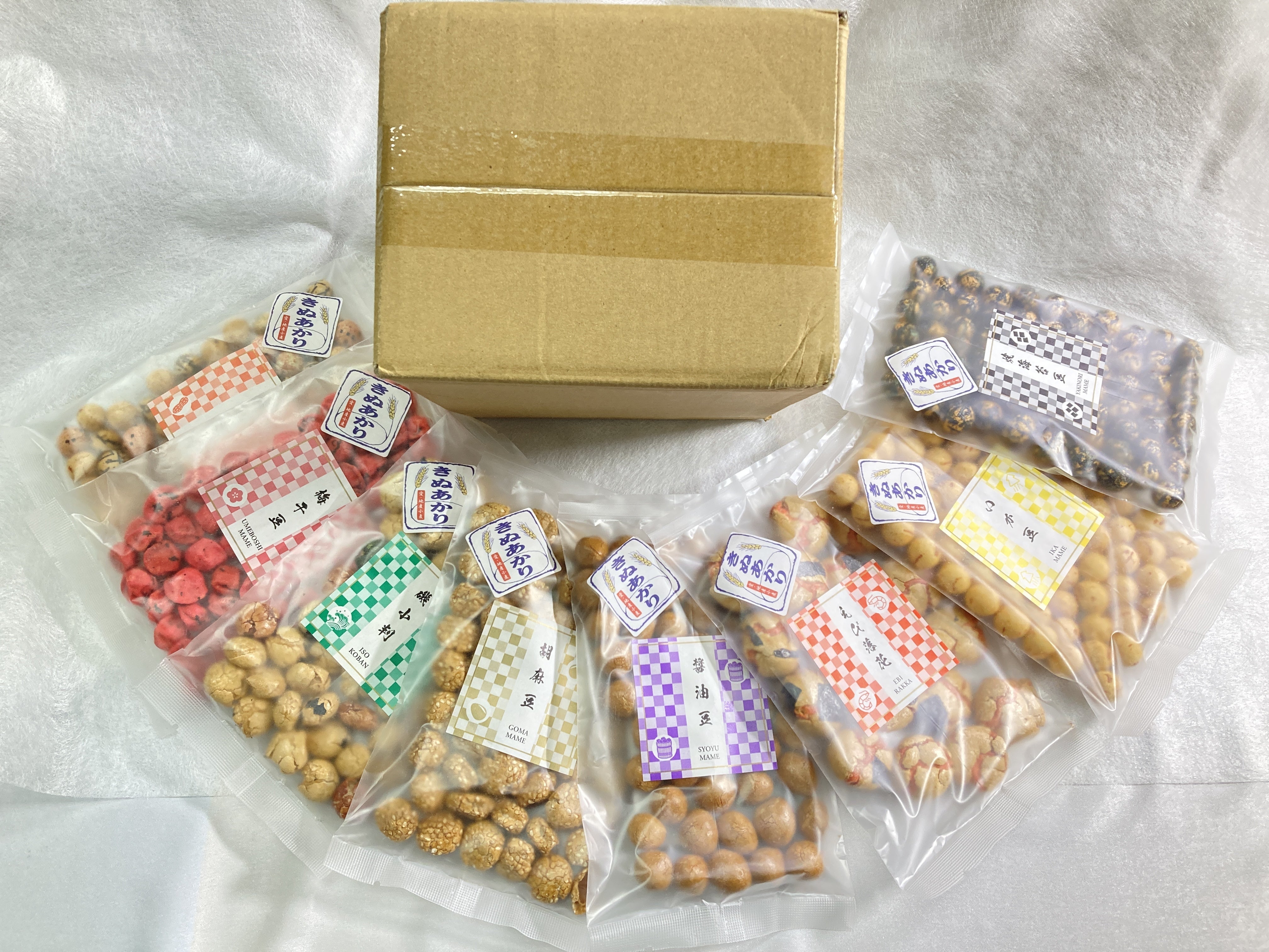左から、えび落花、磯小判(刻海苔・醤油・青海苔)、胡麻豆、梅干豆、いか豆、醤油豆、豆御膳(エビ・刻海苔・青海苔・いか)、焼海苔豆。