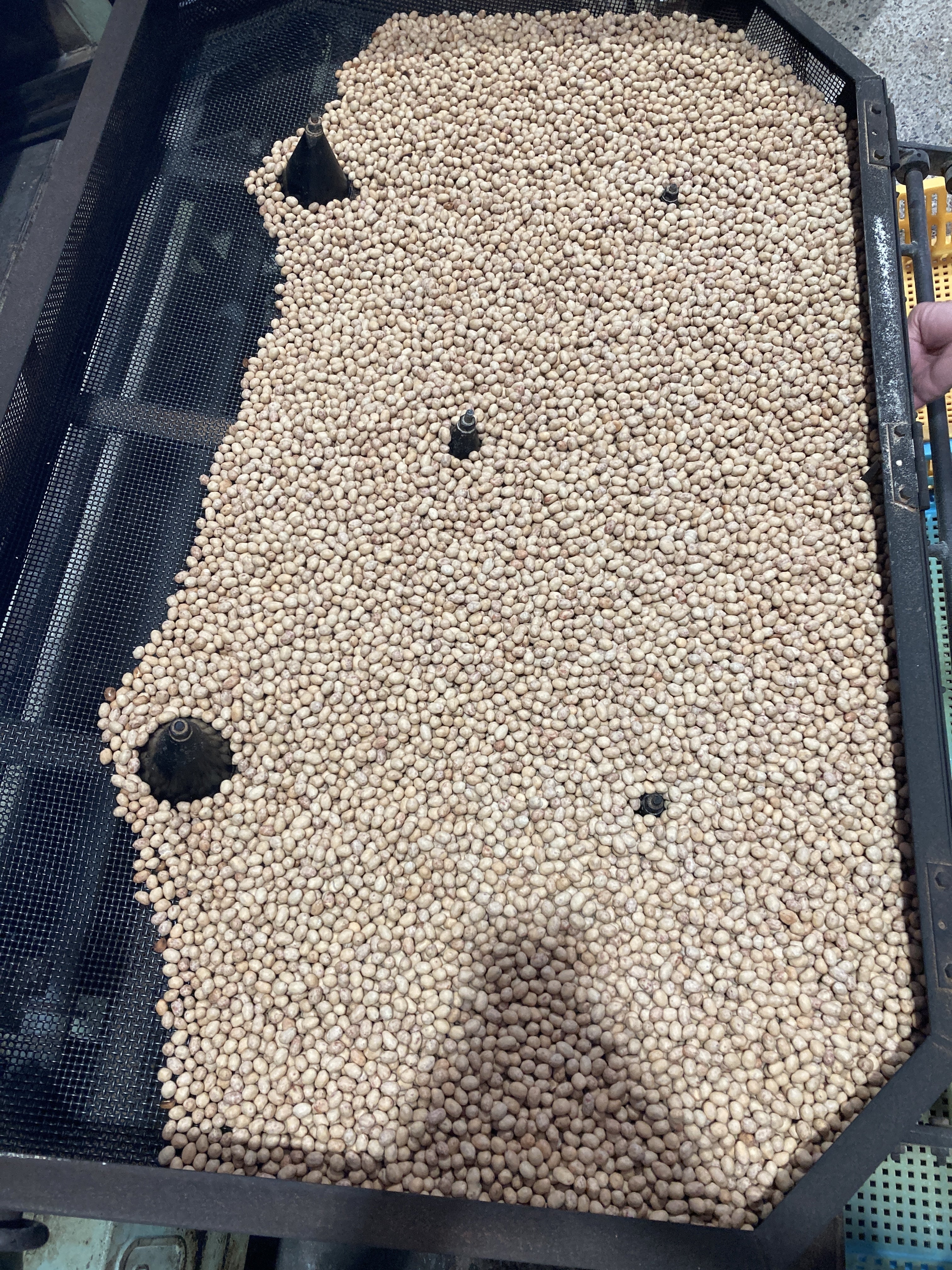 仮煎工程は、薄く落花生の割れの選別や皮剥がれを抑える作業です。
