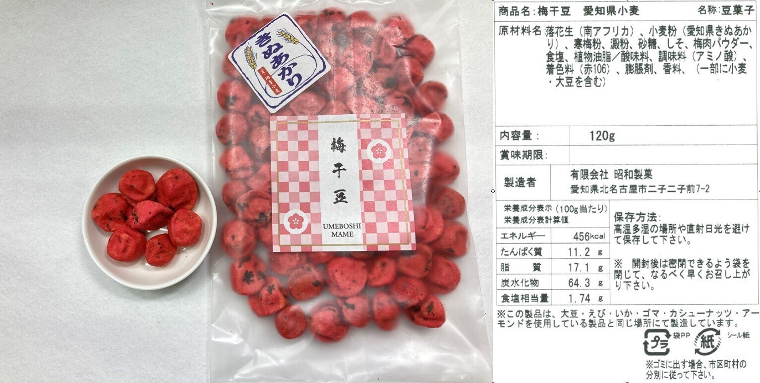 落花生は南アフリカ(小粒)とアメリカ産(大粒)寒梅粉(もち米)砂糖(北海道産、グラニュー糖と三温糖)他海苔は愛知・三重・九州産を使用いたしました。味付けの醤油については、愛知県知多市にございます、丸又商店様の本たまり醤油をふんだん使った自家製のタレで味付け致しました。梅干豆に至っては紀州南光梅の梅肉と和歌山県産しそを使っております。各製品案内に記載致しましたので案内欄をご覧頂けましたら幸いです。