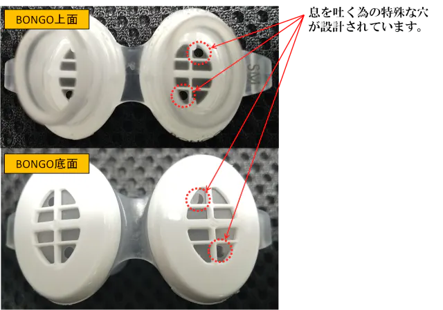 実は吐く息を利用していびきをケアする構造になっています。例えるのであれば、人工呼吸器などに使われる1方向弁のような仕組み。。さらに簡単に言うと、石油ストーブに灯油を補給するときにシュポシュポって使ったことありませんか?1方向に灯油が流れるけど逆方向には流れない。そんなイメージで、息を吸うときは普通に吸えますが、息を吐くときにはこの小さな穴から息が排出される仕組みです。。とにもかくにもまずは使ってみていただきたい商品です!ボンゴはご自身の呼吸を利用していびきをケアできる素晴らしいアイデアのもとに生まれた商品なんです!