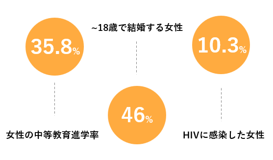 ・中等教育へ進学する女性の割合は35.8%に留まっている。早期妊娠・結婚や生理へのからかい、家事優先により学校に通えなくなるといった理由がある。(男性40.9%)(EMIS「Malawi Education Statistics 2017/18」)
