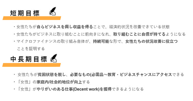 そのために貧しい人々に無担保で少額の融資を行う貧困層向けのサービスである、マイクロファイナンスを導入することで、当事者である彼女たちが主体となってビジネスに取り組み貧困状態を改善できるシステムを構築する予定です。
