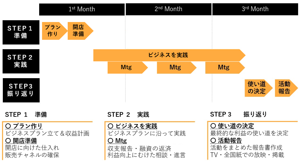 ビジネスを始める準備段階及び開業後に、それぞれ定期的なワークショップ兼ミーティングを実施します。内容につきましては、準備段階では開業にむけたトレーニング、開業後は収支管理及び売上向上にむけたアドバイスの機会としております。