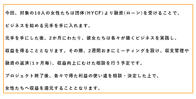 2か月という限られた時間の中で女性たちはビジネスに挑戦するという事情を考慮し、このトライアルでは女性サイドに有利に働くように融資返済を設定しております。