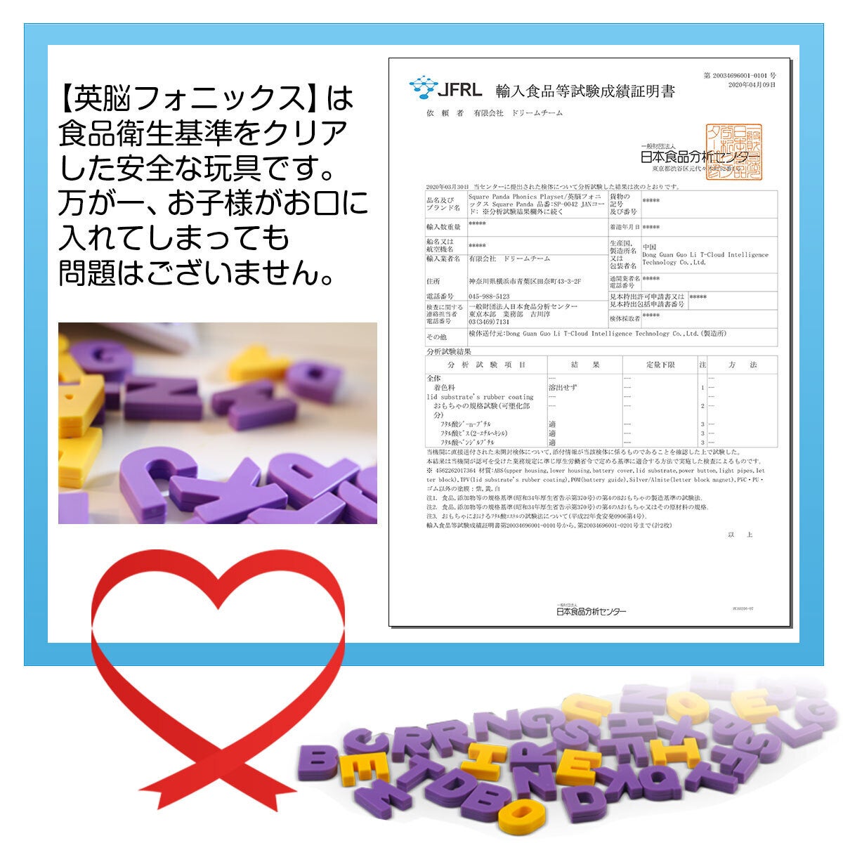 【英脳フォニックス】は、食品衛生基準をクリアした安全な玩具ですので、万一お子様がなめてしまっても、人体に害はありません。