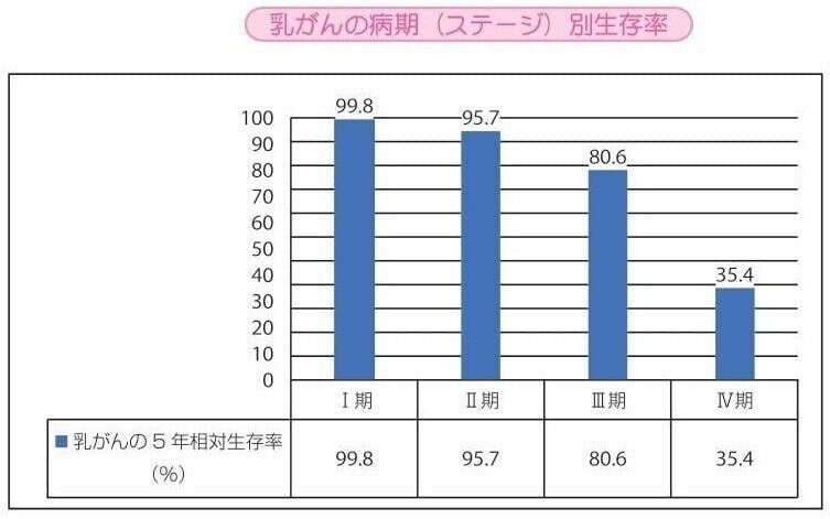 早期発見といわれるステージ0期とⅠ期で乳がんが発見される割合を見ても、35歳以上は80%なのに対し35歳未満は40%と低く、リンパ節への転移や腫瘍径が大きいなどのステージⅡ期やⅢ期で発見される割合が多くなっています。